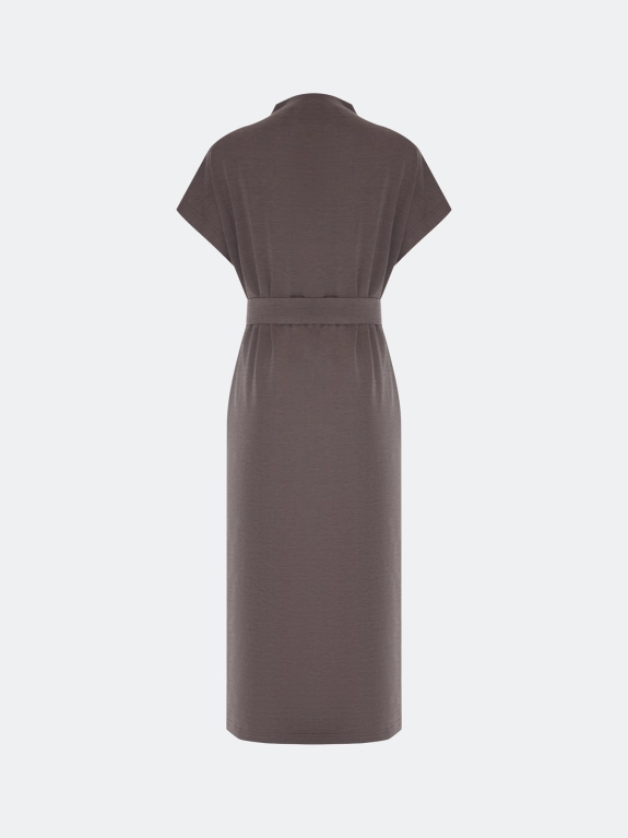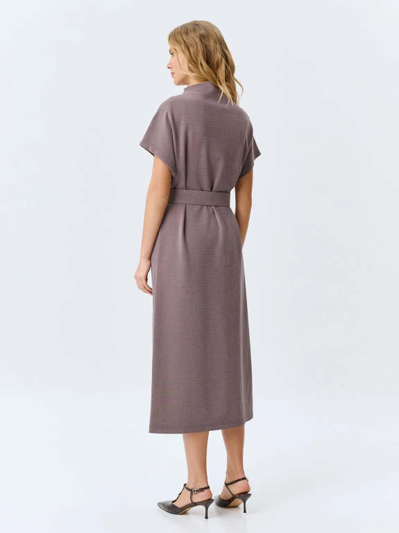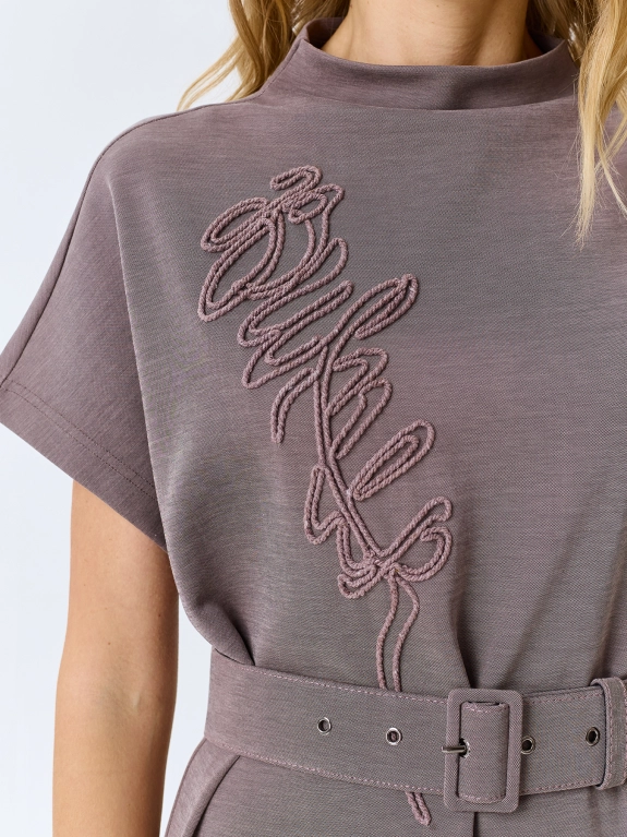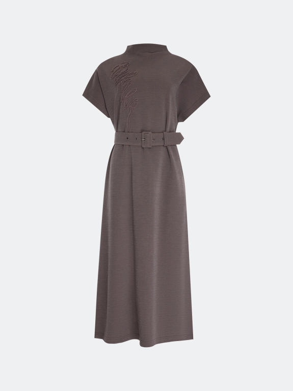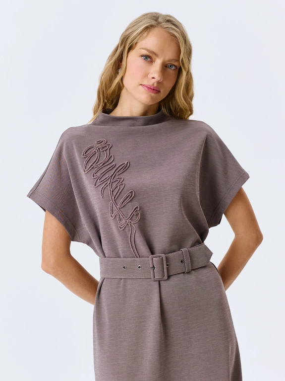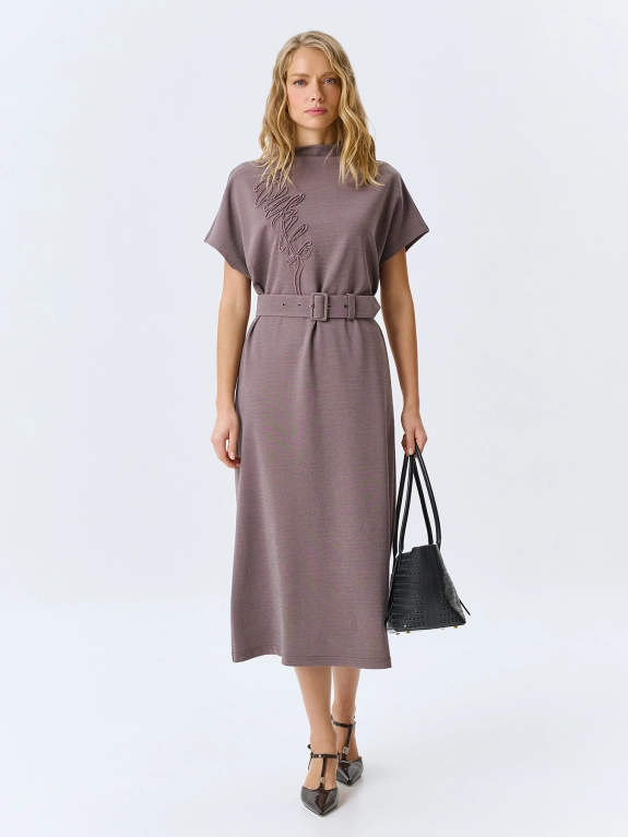 Фактурное трикотажное платье с деликатной вышивкой. Длина миди. Прямой силуэт можно приталить широким поясом. Воротник небольшая цельнокроенная стойка. Короткие цельнокроенные рукава. В составе модал.