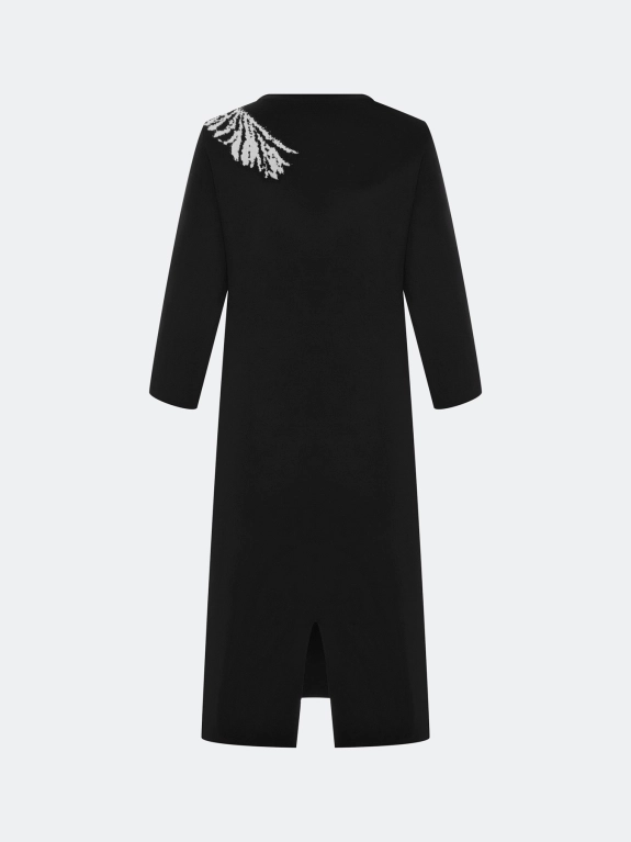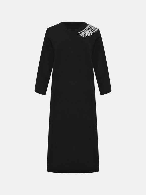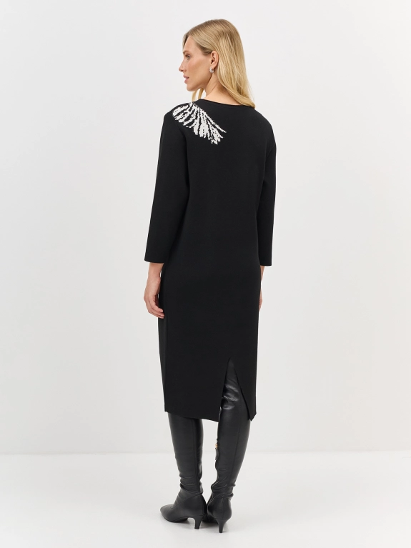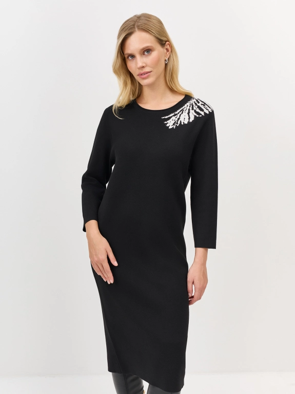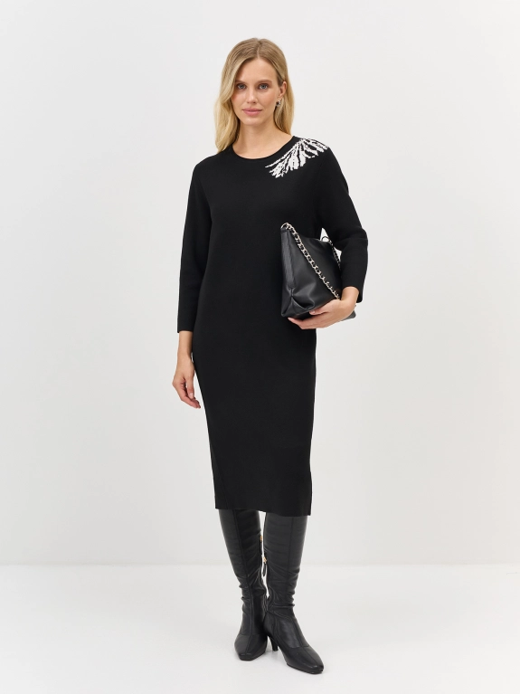 Вязаное платье с контрастным узором в технике интарсия и декором пайетками. Прямой силуэт. Спущенная линия плеч. Длина миди. Круглый вырез. Немного укороченные рукава. В составе вискоза и шерсть.