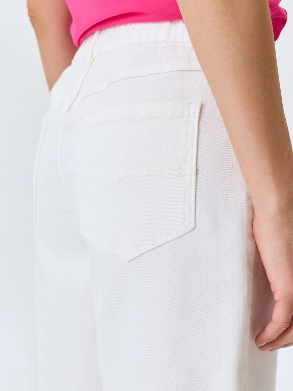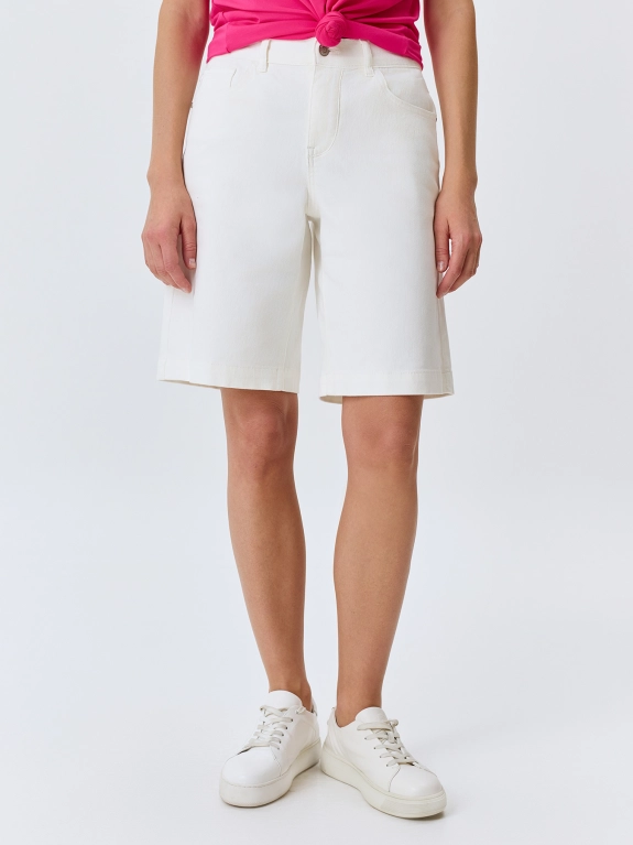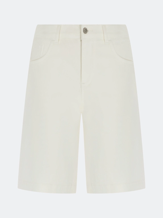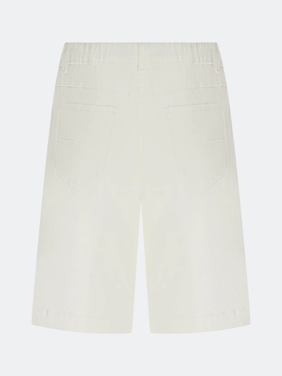 Белые джинсовые шорты-бермуды. Прямой силуэт. Застежка на молнию и металлическую пуговицу. Пять карманов. Резинка по линии талии по спинке. В составе спандекс.