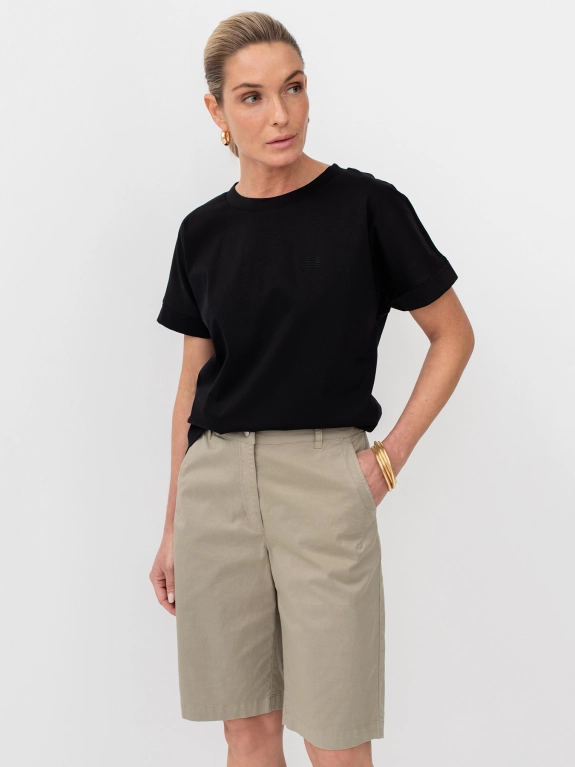 Хлопковые бермуды, слегка зауженные к колену. Боковые карманы. Пояс и шлевки для ремня.