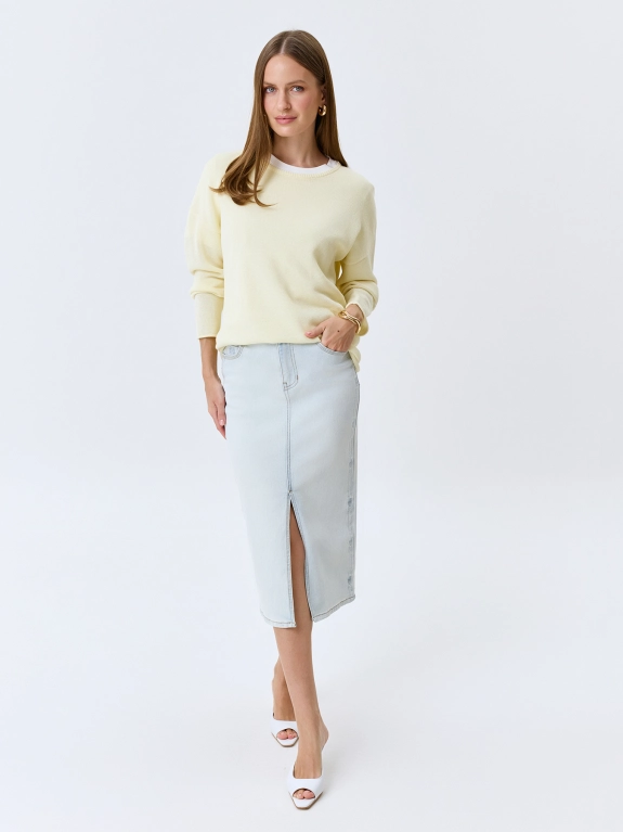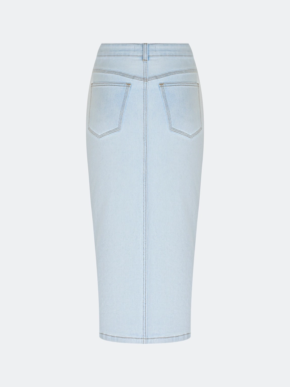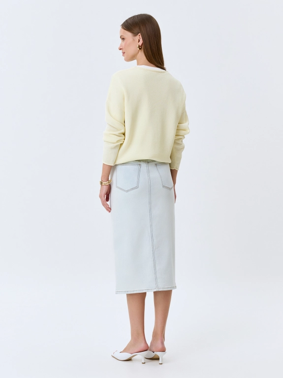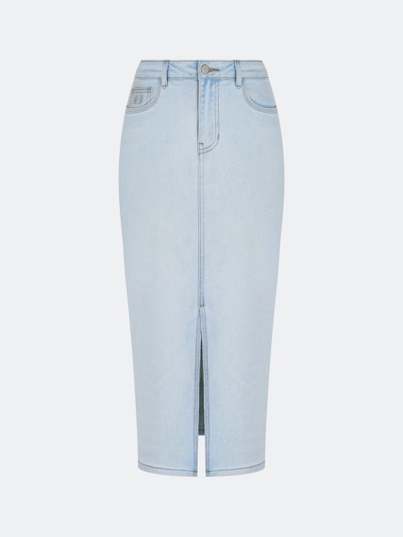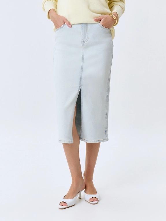 Джинсовая юбка-миди с деликатными лампасами в цвет. Прямой силуэт. Застежка на молнию и металлическую пуговицу. Пять карманов. Дополнена акцентным разрезом спереди. В составе спандекс.