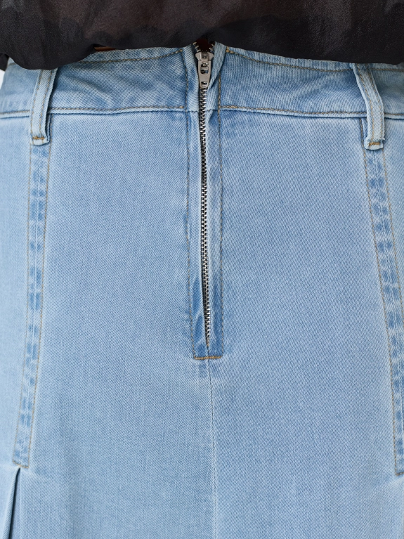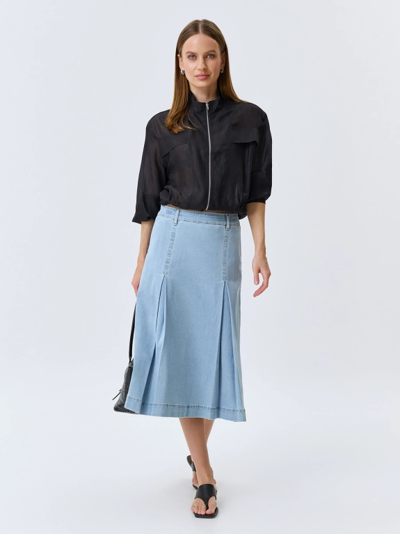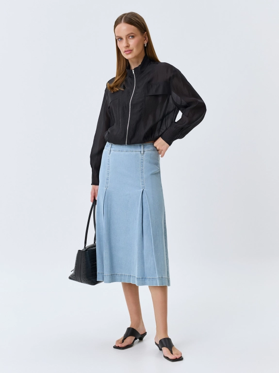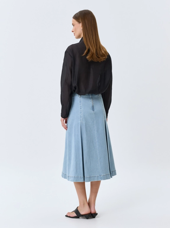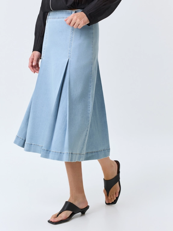 Джинсовая юбка-миди с мягкими встречными складками. А-силуэт. Застежка на молнию. Пояс дополнен шлевками. В составе хлопок и спандекс.