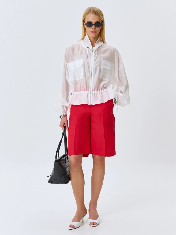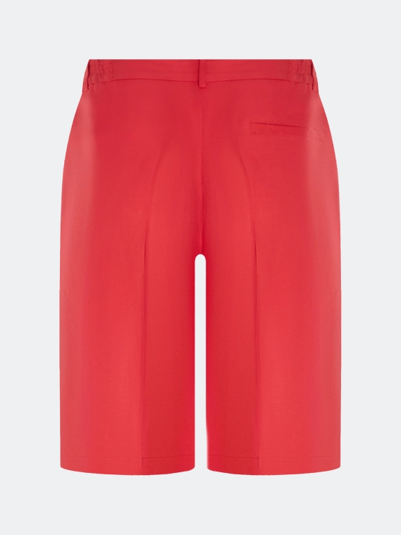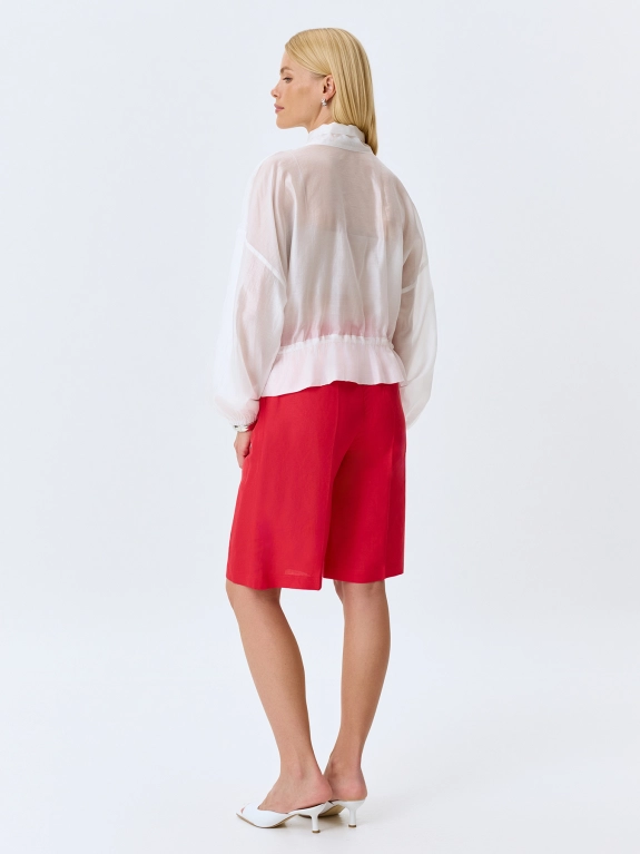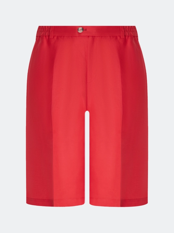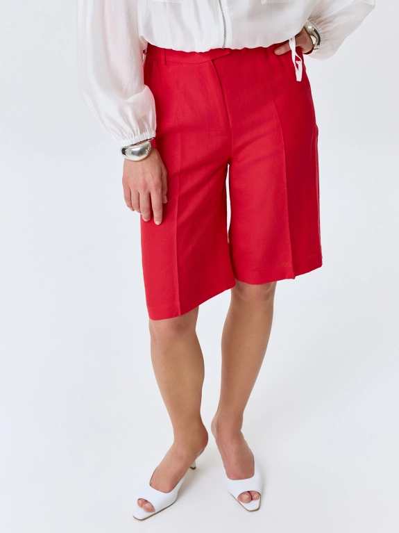 Шорты-бермуды из смесового льна и вискозы. Прямой силуэт. Застежка на молнию и пуговицу. Резинка по линии талии по спинке. Боковые карманы в швах. Дополнены мягкими стрелками.