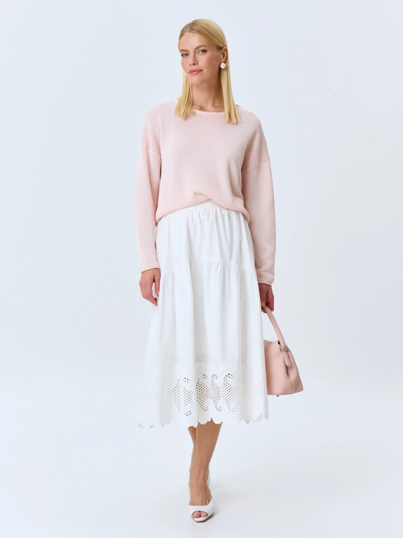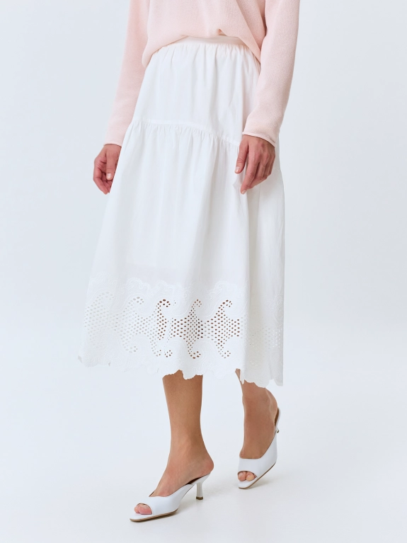 Ярусная юбка-миди из 100% хлопка с ажурной вышивкой ришелье. Свободный силуэт. Резинка по линии талии по спинке. Дополнена фигурным краем.
