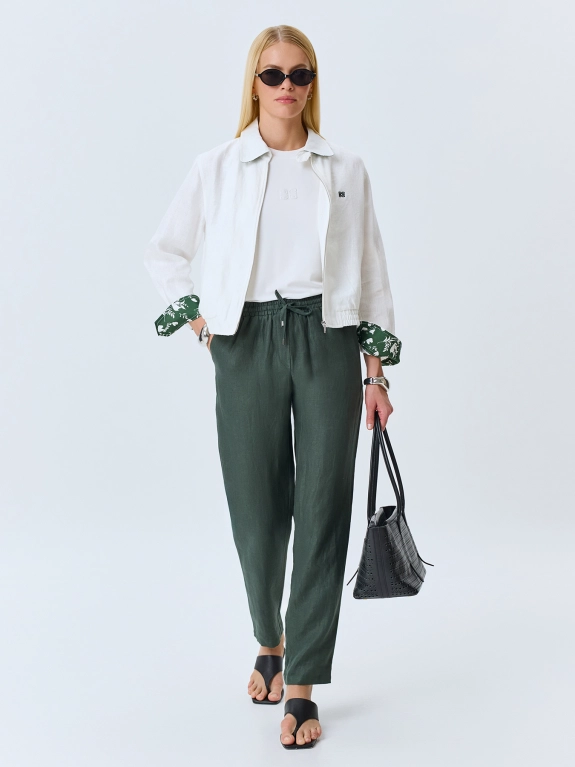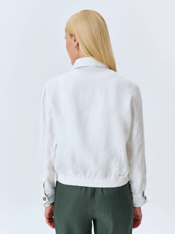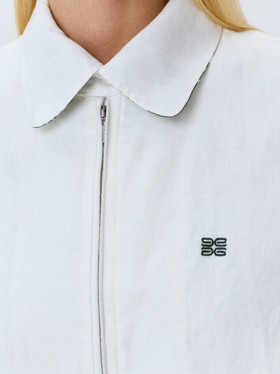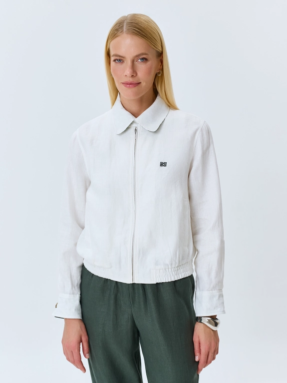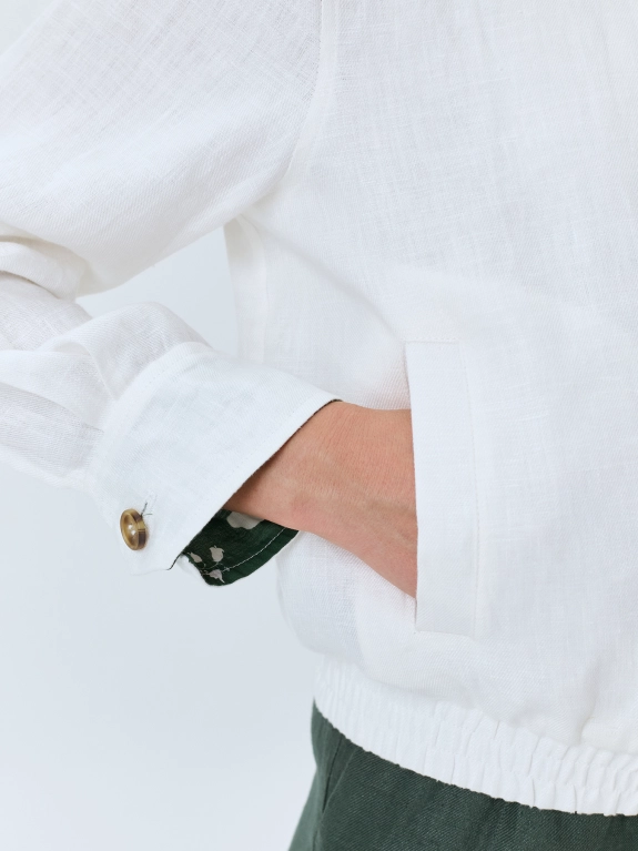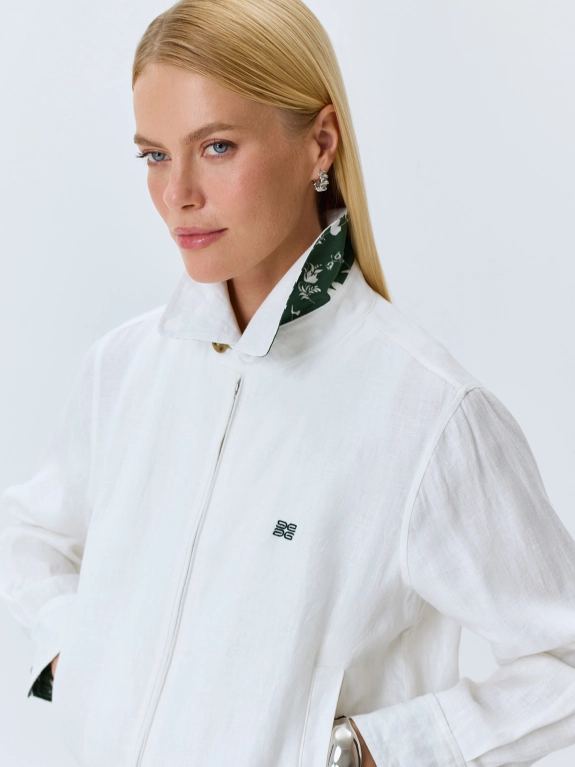 Свободный бомбер из 100% льна. Застежка на молнию. Отложной воротник на пуговице с контрастной принтованной подкладкой. Спущенная линия плеч и длинные втачные рукава с контрастными принтованными манжетами по низу. Дополнен контрастной брендированной вышивкой и резинкой по низу изделия.
