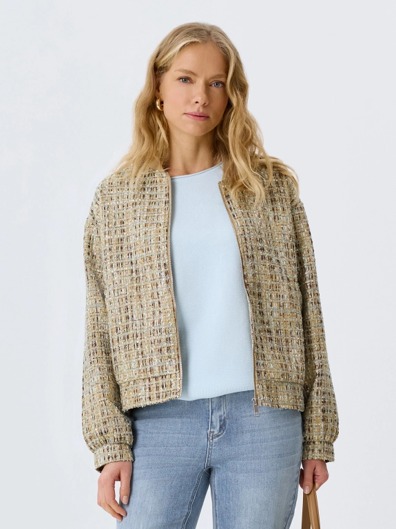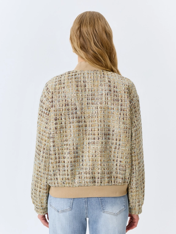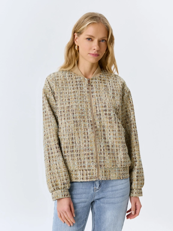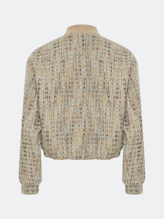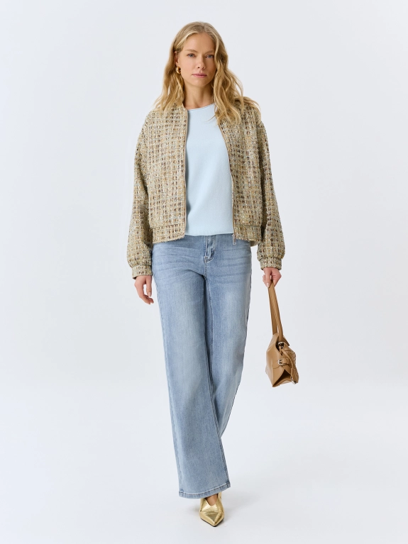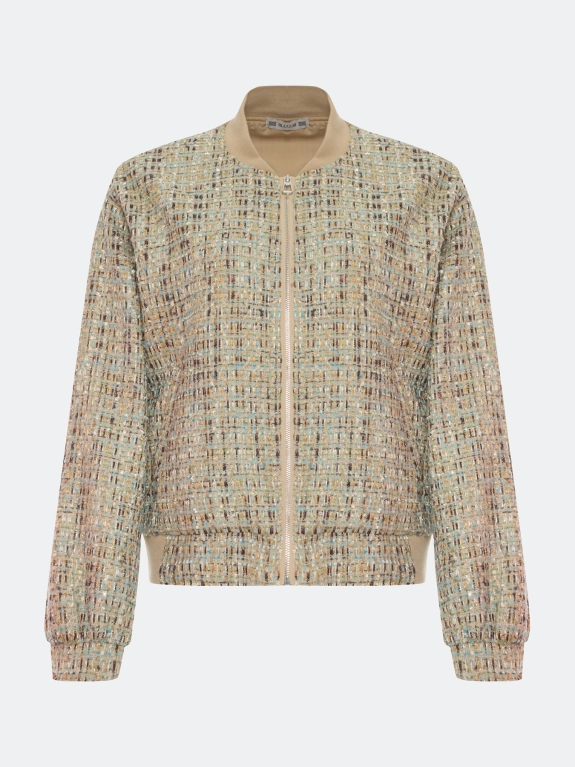 Легкий свободный жакет-бомбер из сияющего твида. Свободный силуэт. Трикотажный воротник. Застежка на молнию. Спущенная линия плеч. Дополнен эластичными манжетами по низу изделия и рукавов.