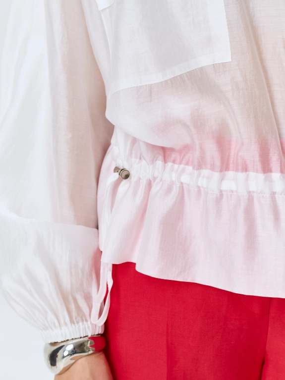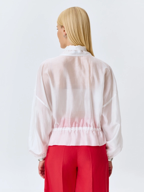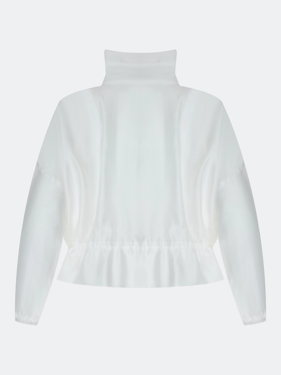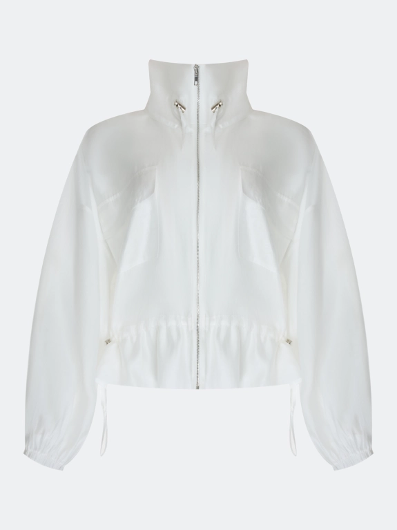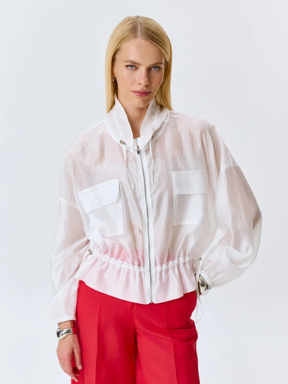 Полупрозрачный тонкий жакет из тенселя. Свободный силуэт. Высокий воротник стойка дополнен утяжниками. Застежка на молнию. Спущенная линия плеч и длинные рукава с резинкой по низу. Накладные боковые карманы с клапанами. Дополнен кулисой по низу изделия.