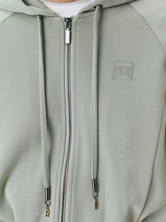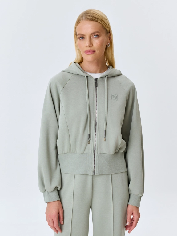 Укороченный бомбер с капюшоном из смесового трикотажного пике. Свободный силуэт. Воротник дополнен капюшоном с кулисой и шнурком. Застежка на молнию. Объемные рукава реглан. Дополнен рибом по низу рукавов и изделия. Комплект с 4267855.