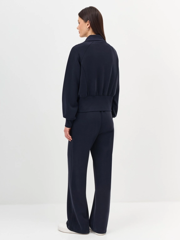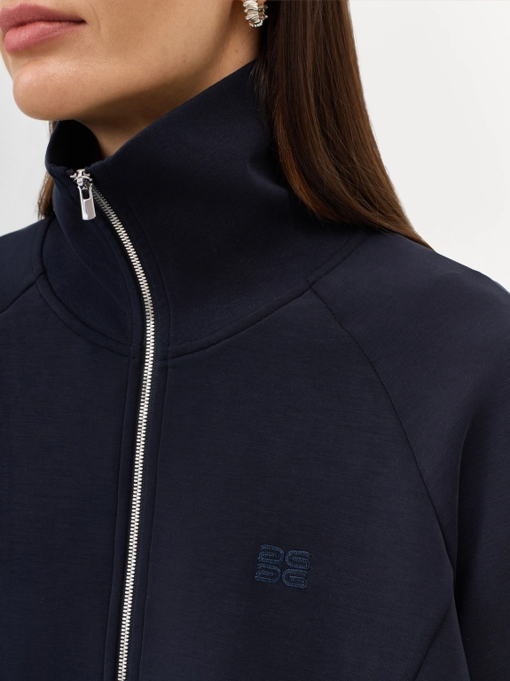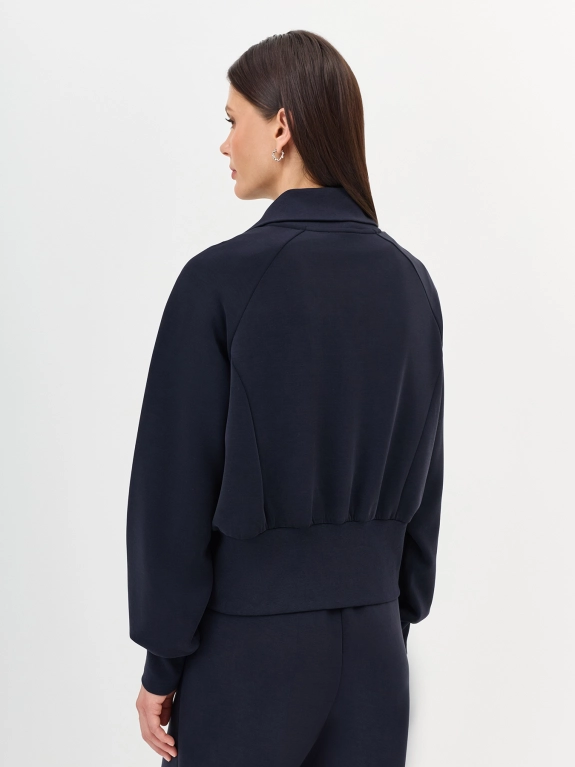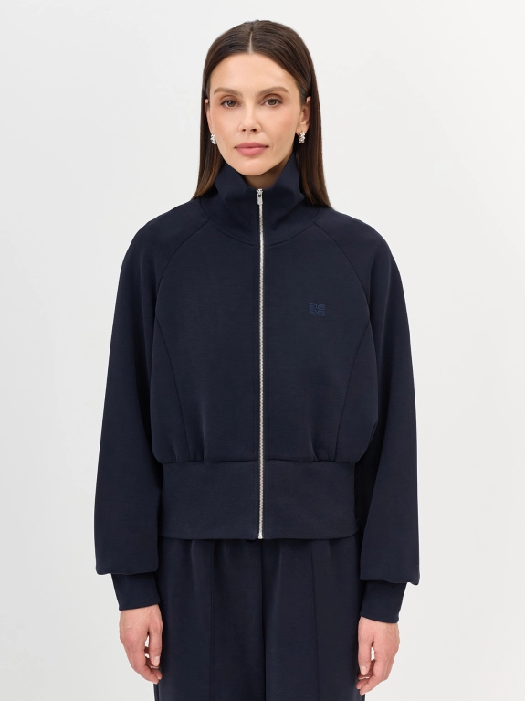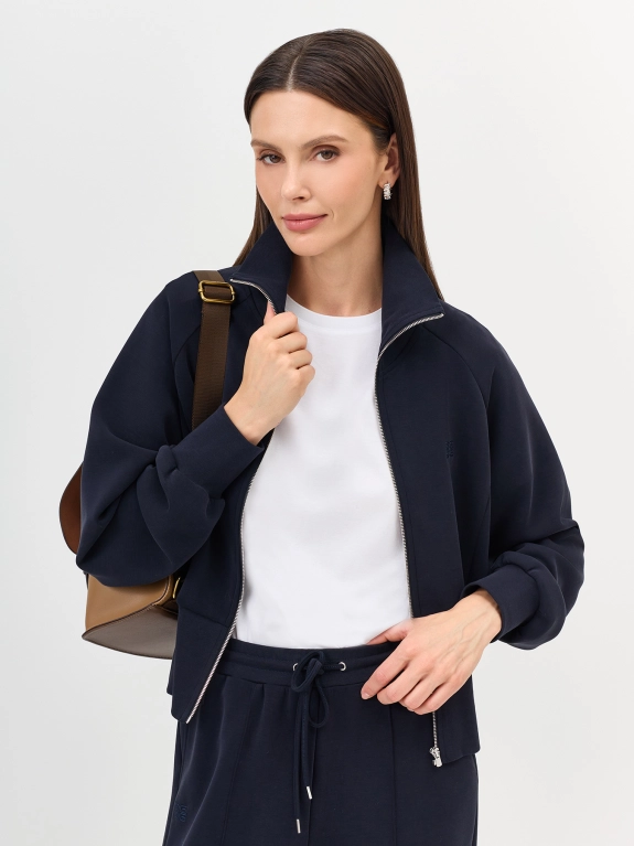Укороченный трикотажный бомбер с высоким воротником стойкой. Свободный силуэт. Высокий пояс-кокетка. Застежка на молнию. Рукава реглан с манжетами. Дополнен деликатной вышивкой в цвет. В составе модал. Комплект с арт. 5257830.