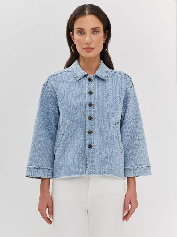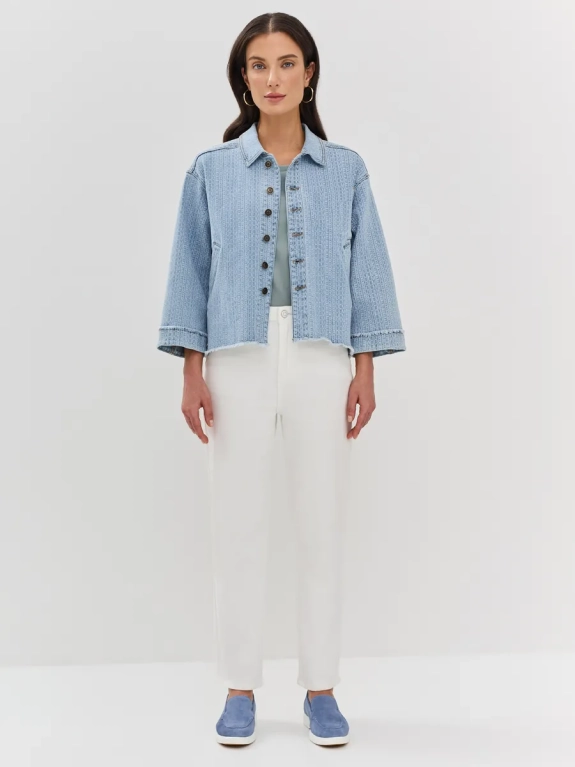 Джинсовая куртка выполнена из плотного материала с добавлением хлопка, полиэстера, вискозы и спандекса, что обеспечивает комфорт и свободу движений и отлично садится на любую фигуру. Декоративные элементы в виде уникального принта, вышивки и бахромы добавляют изделию индивидуальности и эксклюзивности.