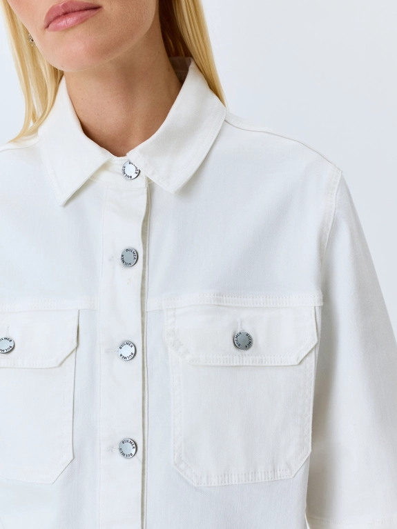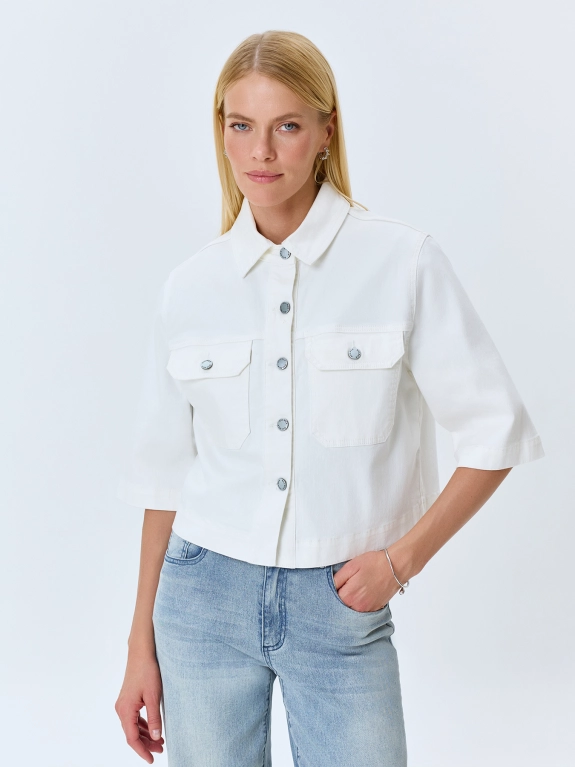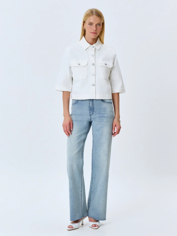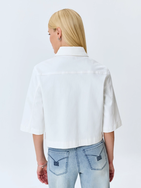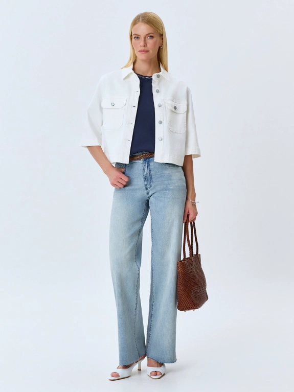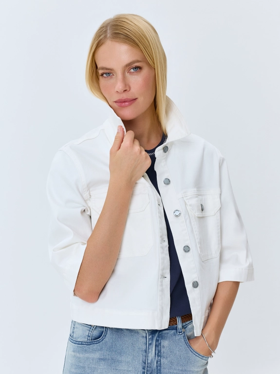 Укороченный джинсовый жакет из 100% хлопка. Прямой силуэт. Отложной воротник. Застежка на металлические пуговицы. Накладные нагрудные карманы с клапанами. Спущенная линия плеч и втачные рукава 3/4.