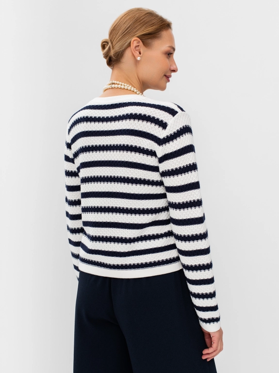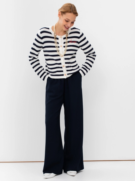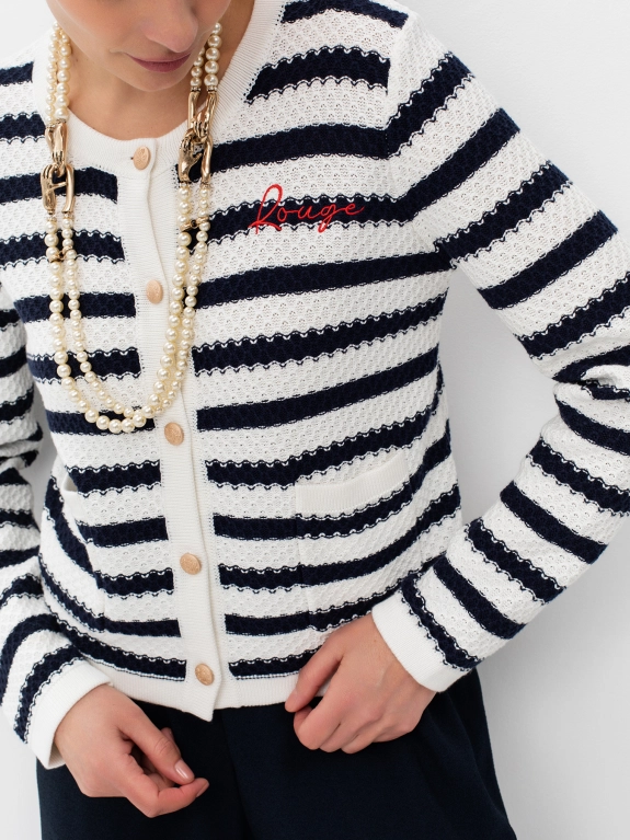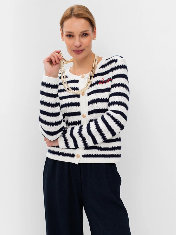 Вязаный кардиган в полоску. Фактурная вязка. Контрастная вышивка на груди. Накладные карманы. Застежка на пуговицы. Прямой силуэт.