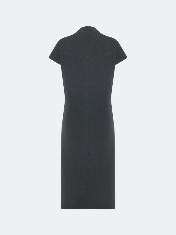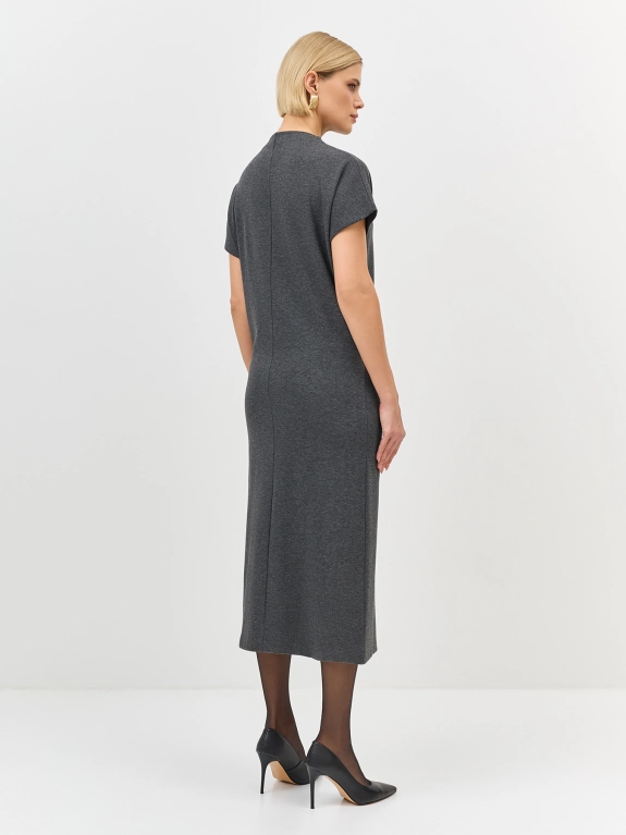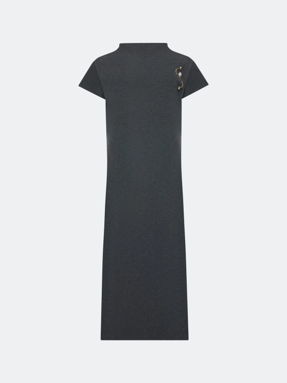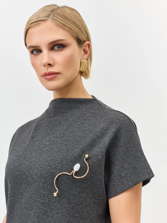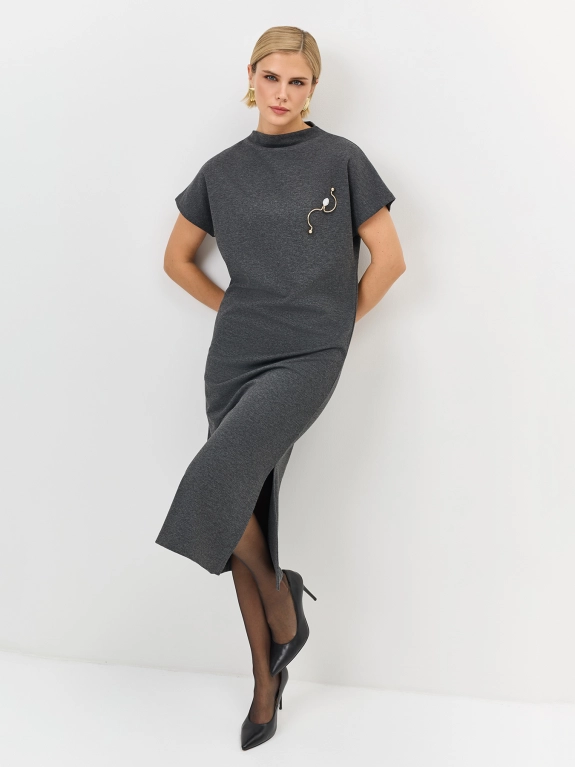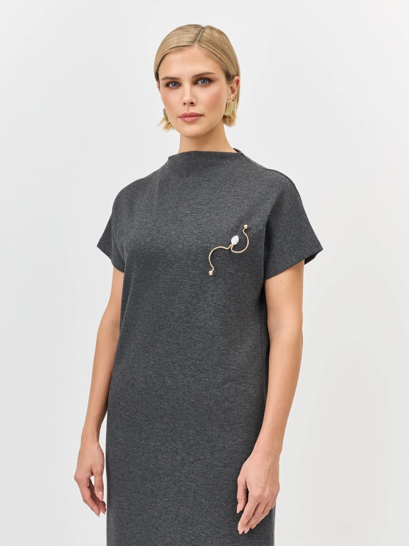 Трикотажное платье-миди прямого силуэта с коротким рукавом. Воротник стойка. Дополнено акцентной брошью. Застежка на потайную молнию. В составе хлопок.