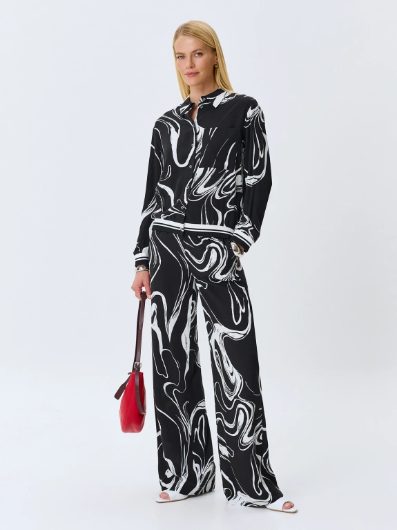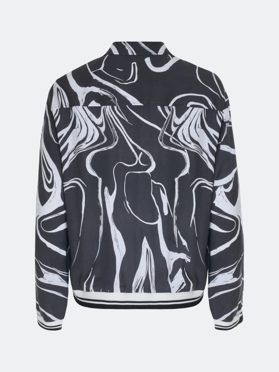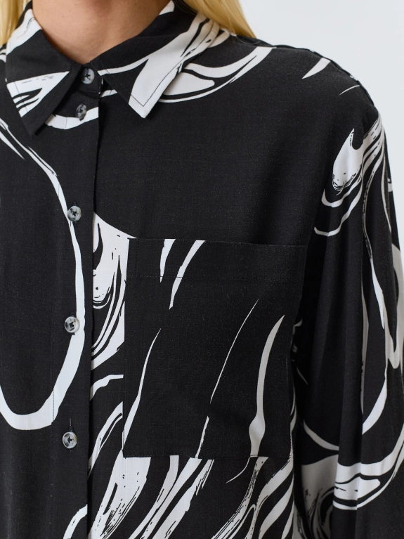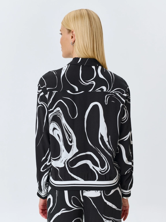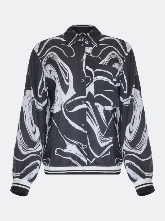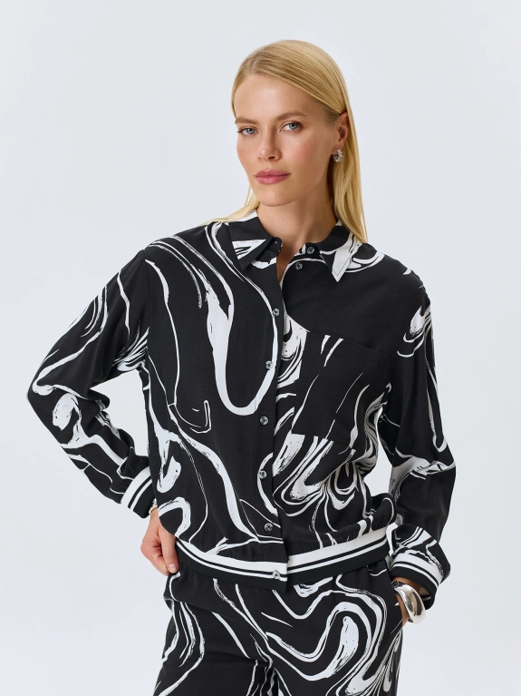 Блузка из 100% района с графичным принтом. Прямой силуэт. Отложной воротник. Застежка на пуговицы. Спущенная линия плеча, длинные рукава с манжетами. Накладной нагрудный карман. Дополнена рибом в полоску по низу изделия и рукавов.