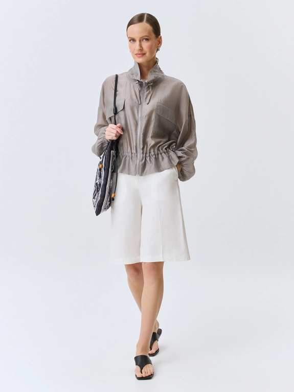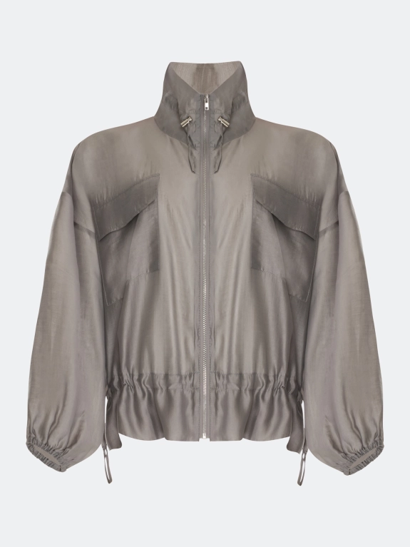 Полупрозрачный тонкий жакет из тенселя. Свободный силуэт. Высокий воротник стойка дополнен утяжниками. Застежка на молнию. Спущенная линия плеч и длинные рукава с резинкой по низу. Накладные боковые карманы с клапанами. Дополнен кулисой по низу изделия.