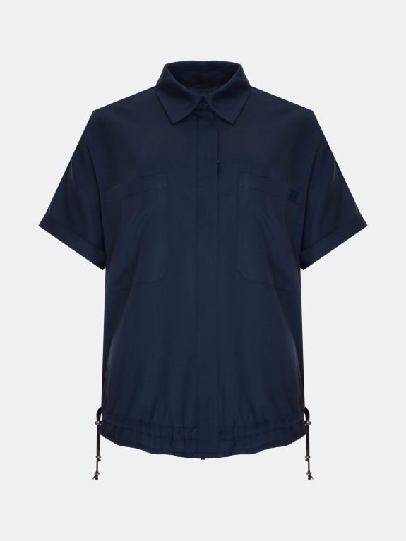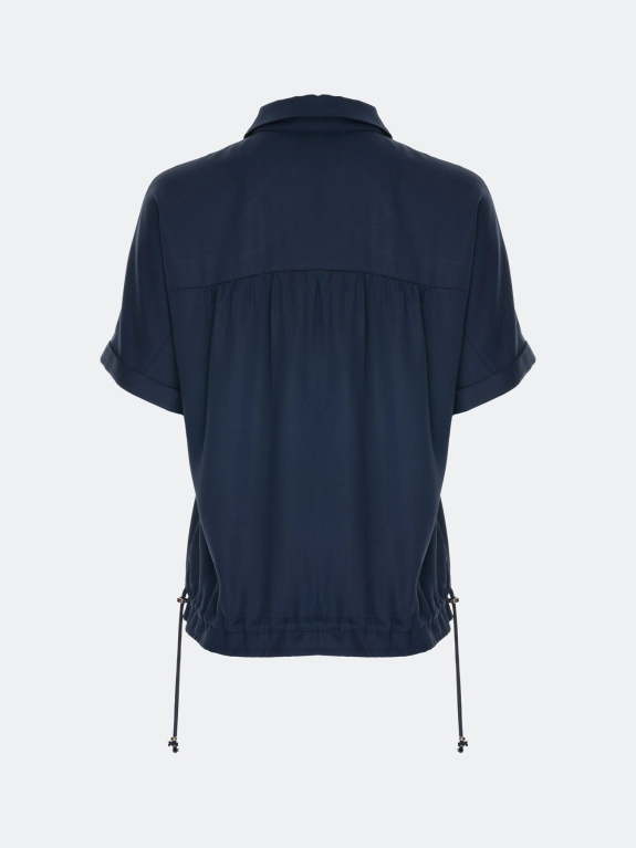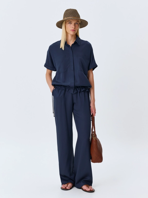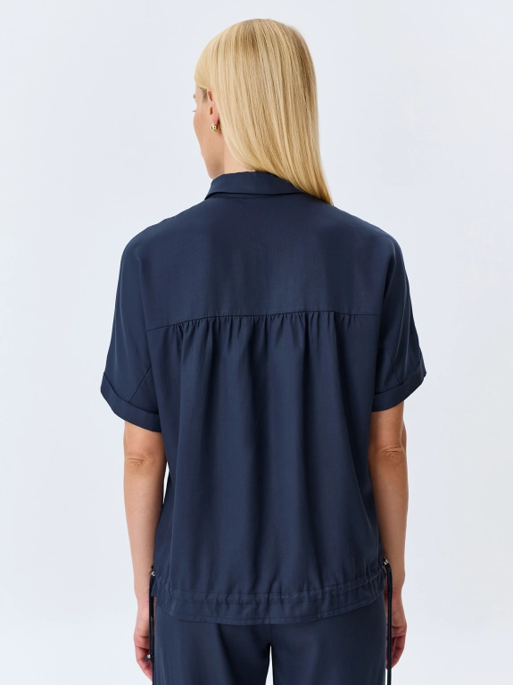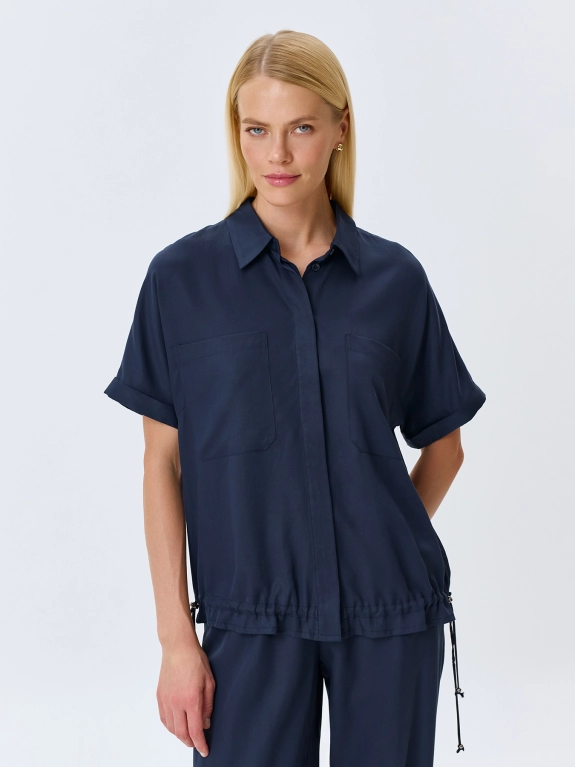 Блузка из 100% тенселя. Свободный силуэт. Отложной воротник. Застежка на пуговицы, скрытые планкой. Укороченные широкие рукава дополнены манжетами-отворотами по низу. Накладные нагрудные карманы. Дополнена кулисой по низу изделия. Комплект с 4267407.