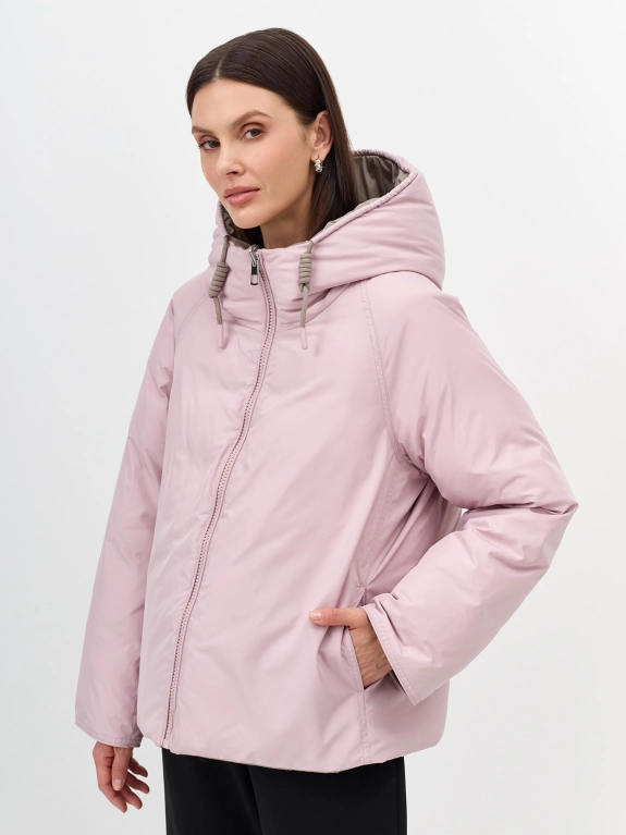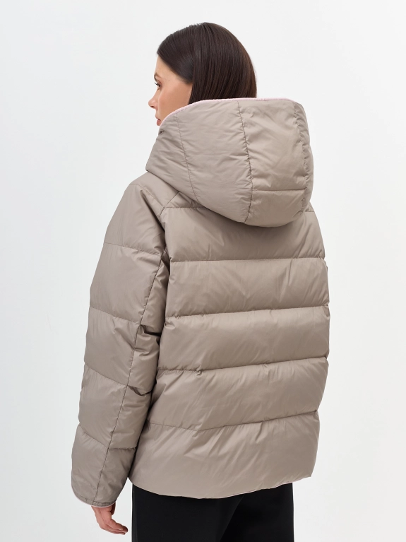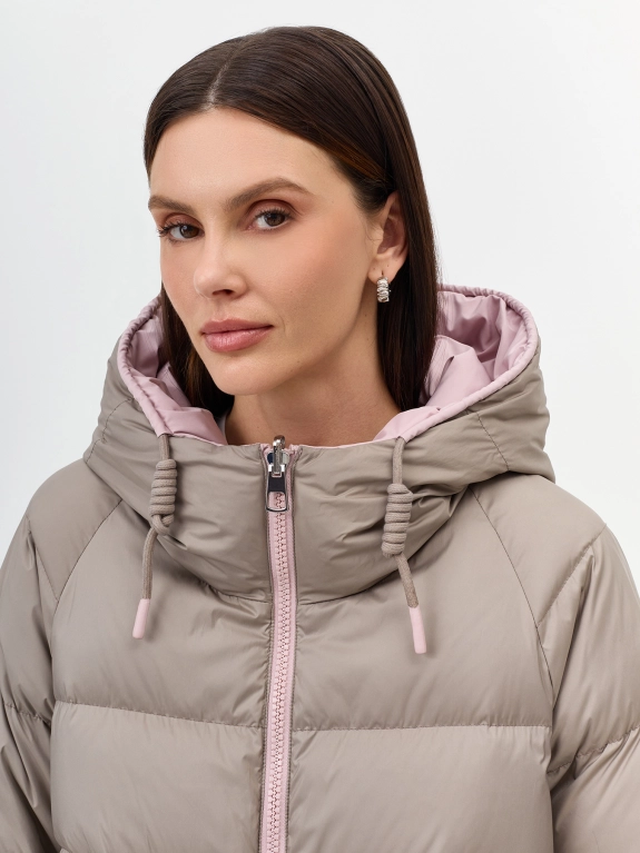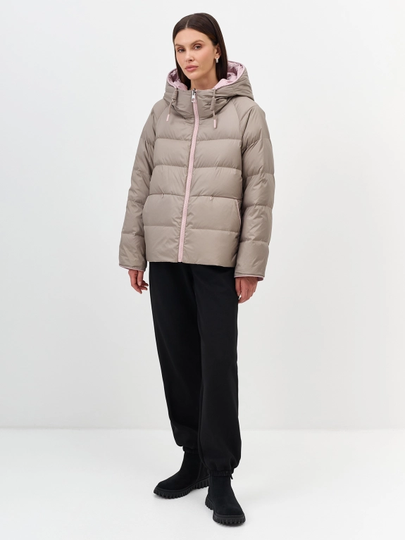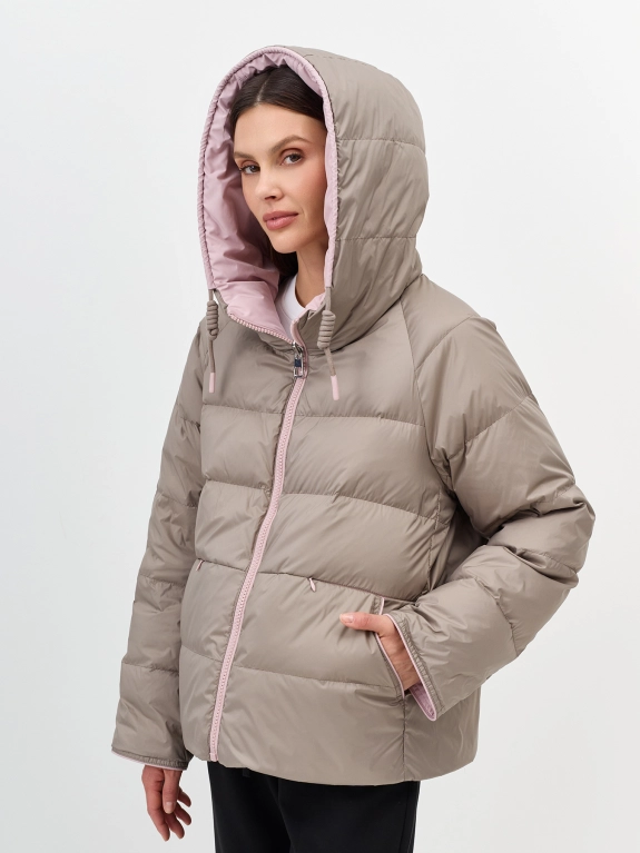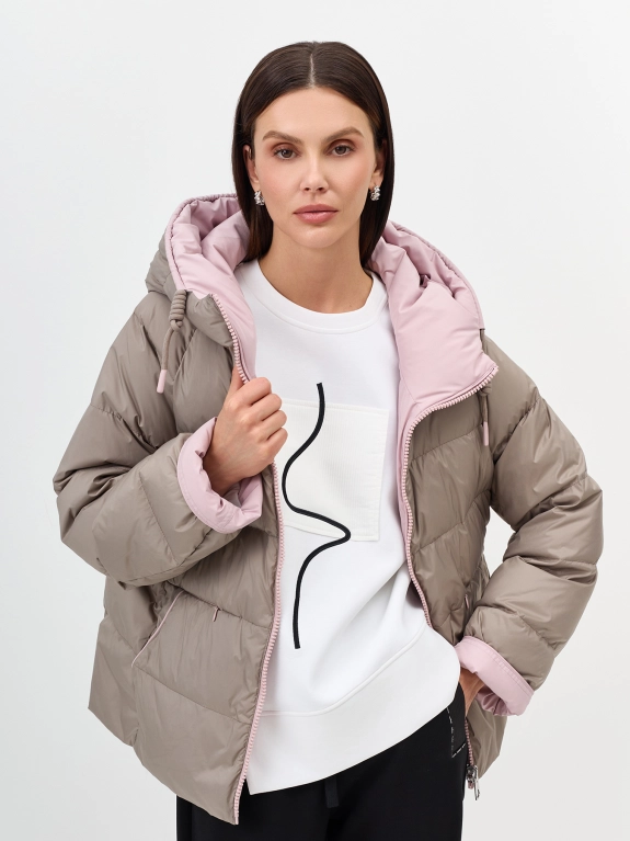 Двусторняя куртка на натуральном утеплителе свободного силуэта. Рукава реглан. Воротник стойка дополнен капюшоном на утяжниках. Застежка на контрастную молнию. Боковые карманы на контрастных потайных молниях. Второй открытый вход в карман сбоку с контрастным кантом. Кулиса по низу изделия для защиты от ветра. Вторая сторона из котрастной ткани без стежки. В качестве утеплителя натуральный пух.