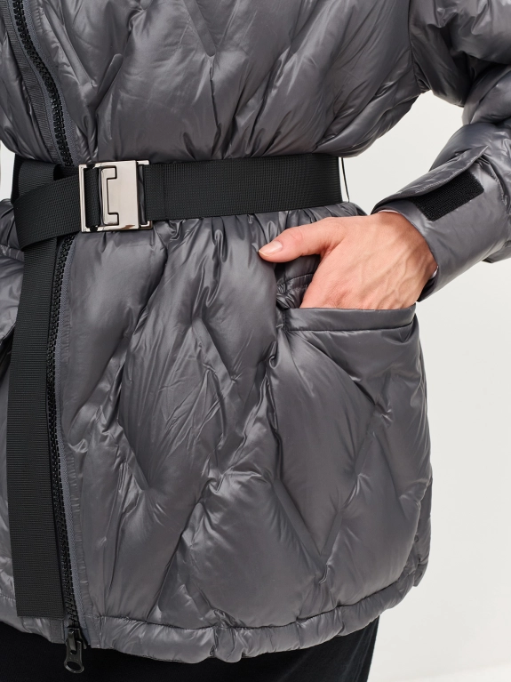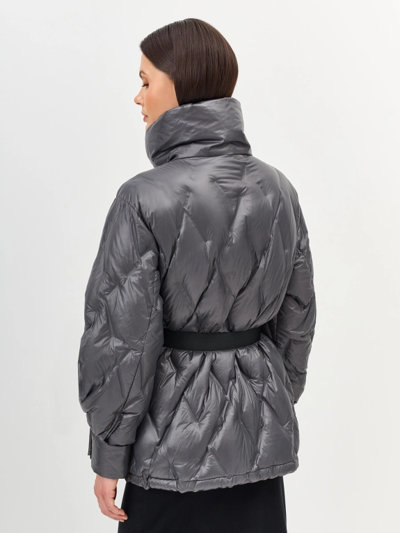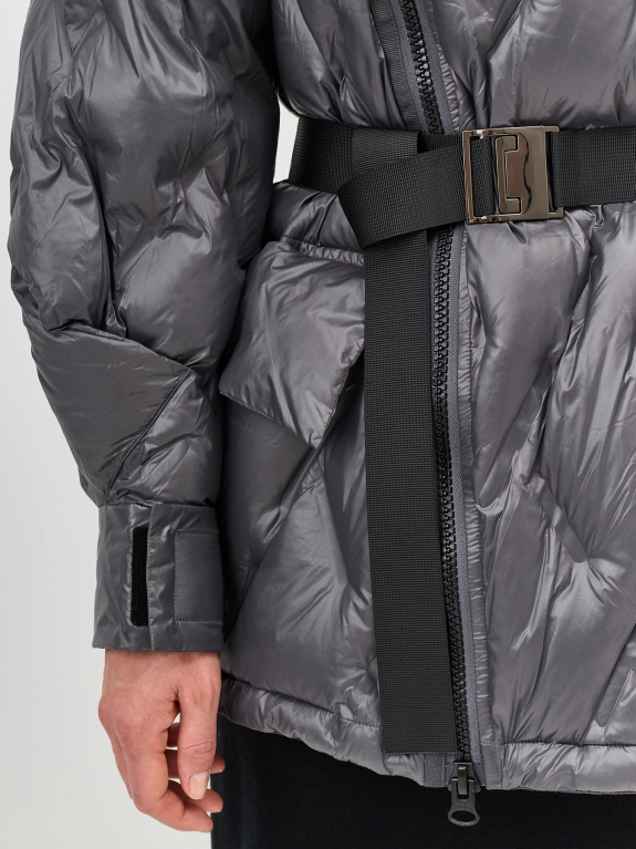 Куртка из глянцевого нейлона с ромбовидной термо стежкой. Свободный силуэт можно приталить съемным поясом. Воротник стойка меняется на асимметричный отложной воротник. Застежка на молнию. Накладные боковые карманы с акцентными клапанами. Манжеты на липучках по низу рукавов. Кулиса по низу для защиты от ветра. Подкладка из 100% нейлона. В качестве утеплителя натуральный пух.