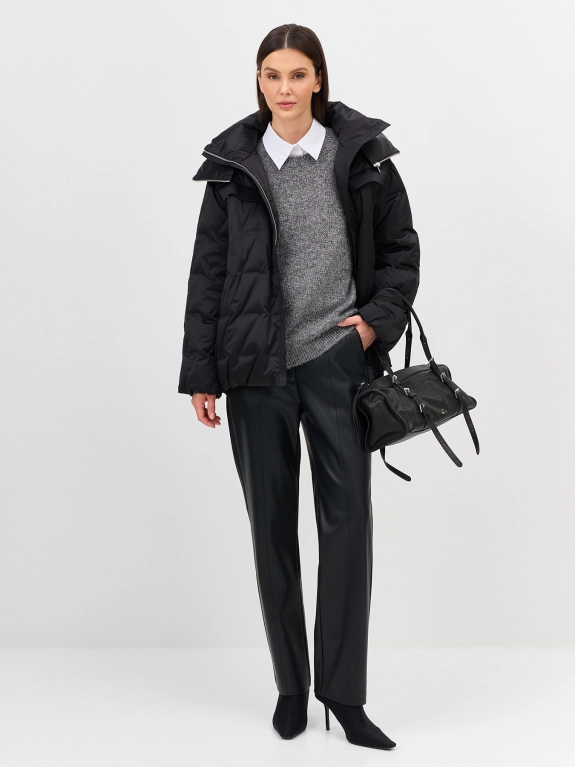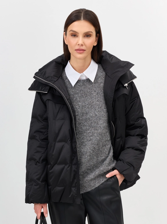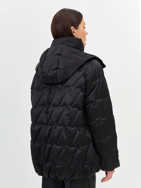 Куртка с фактурной стежкой и капюшоном. Свободный силуэт. Спущенная линия плеч. Застежка на молнию. Утяжники по низу для защиты от ветра. Воротник стойка дополнен капюшоном на молнии. Боковые карманы в швах. В качестве утеплителя натуральный пух.