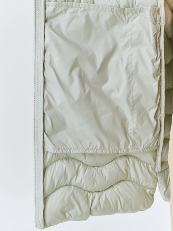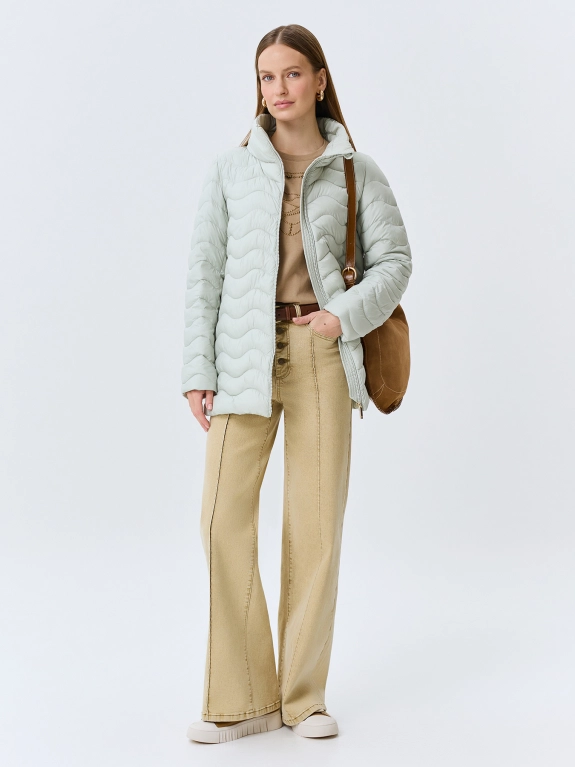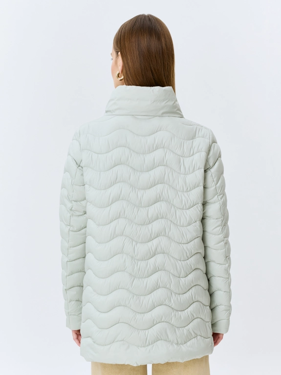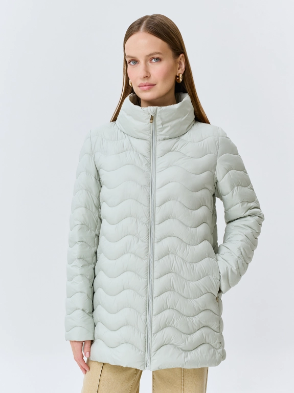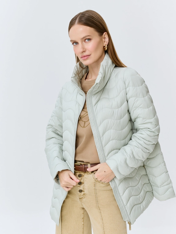Тонкая куртка с фантазийной сквозной стежкой. А-силуэт. Воротник высокая стойка. Застежка на молнию. Боковые карманы на потайных молниях в швах. Искусственный утеплитель.