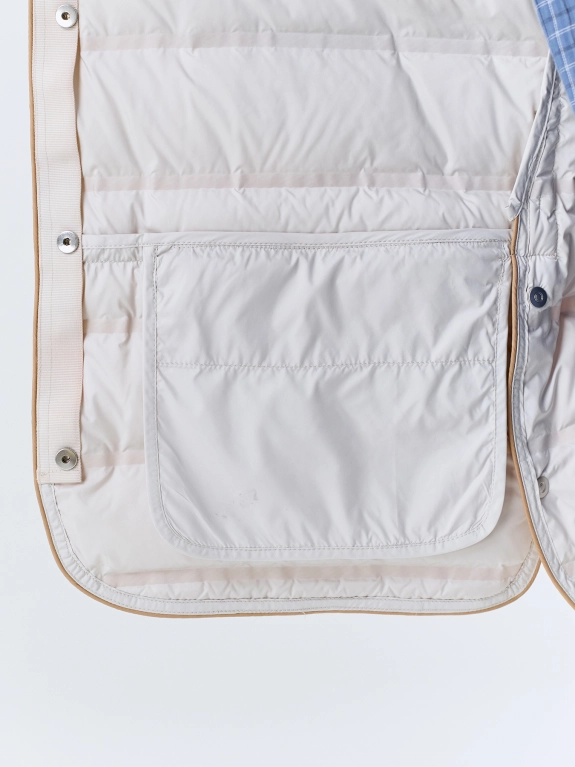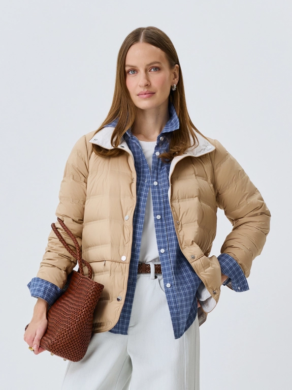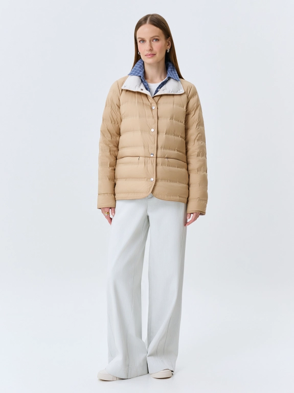 Легкая куртка с горизонтальной горячей стежкой. Прямой силуэт. Воротник стойка на кнопках. Застежка на металлические кнопки. Боковые карманы на молнии. Длинные втачные рукава. Дополнена контрастной подкладкой и акцентными разрезами на кнопках в боковых швах. В качестве утеплителя натуральный пух.