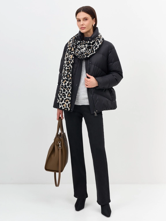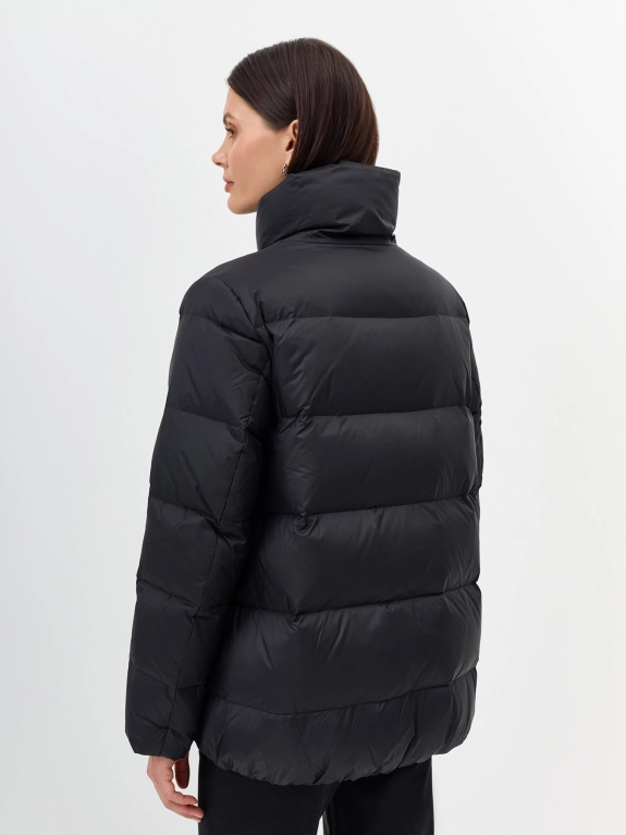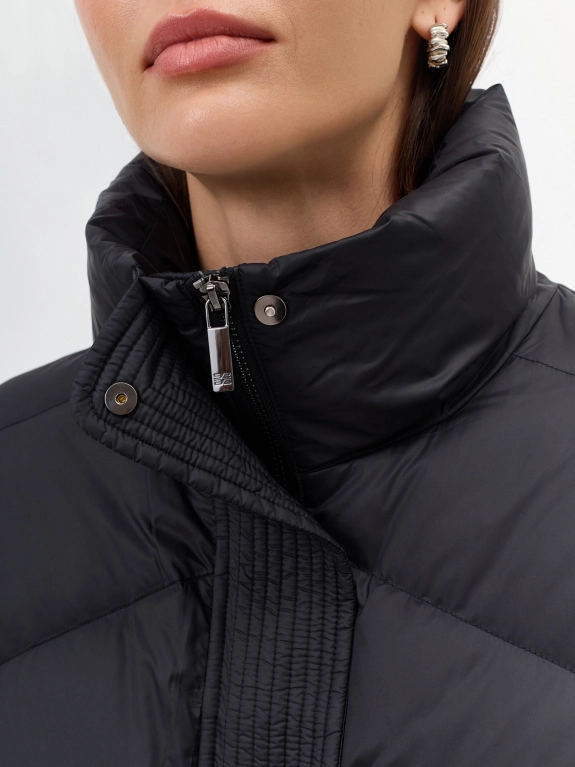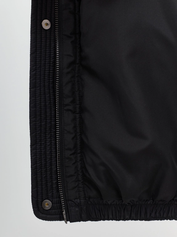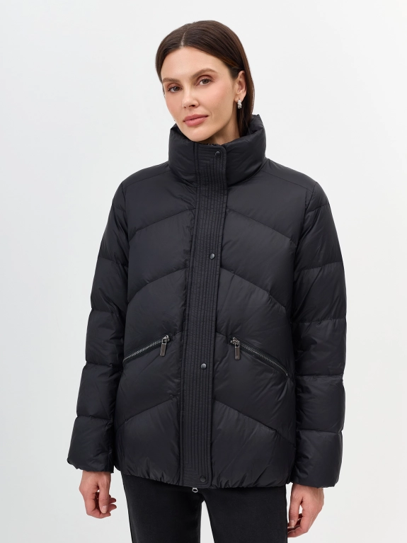 Стеганная куртка из нейлона с натуральным утеплителем. Сочетание диагональной и горизонтальной стежки. Прямой силуэт. Воротник стойка. Застежка на молнию и стеганную планку на кнопках. Боковые карманы на молнии. Кулиса по низу изделия для защиты от ветра. В качестве утеплителя натуральный пух.
