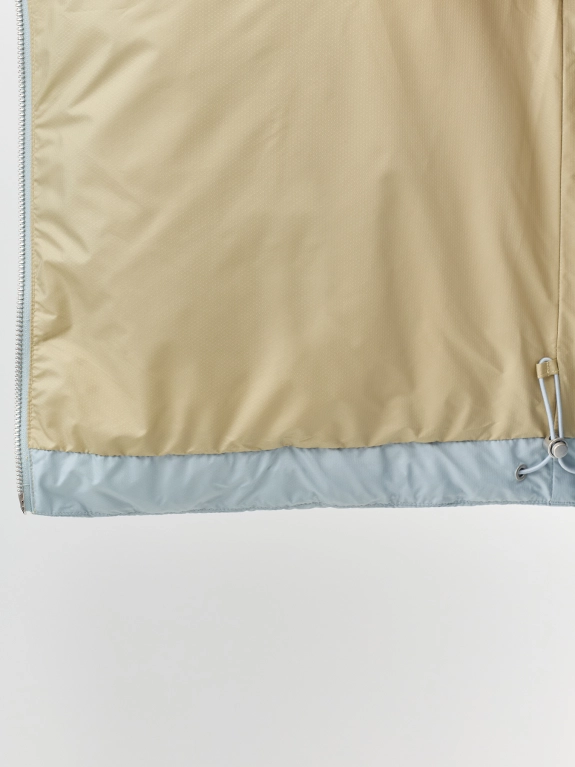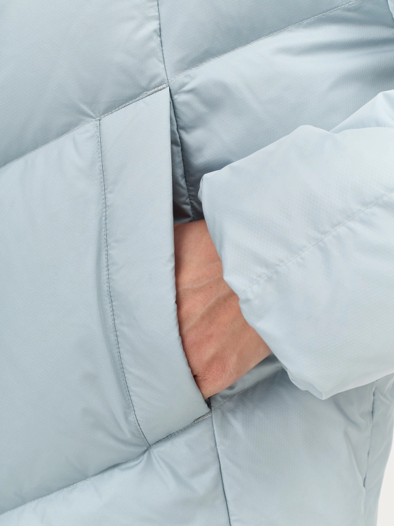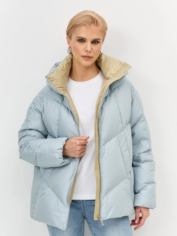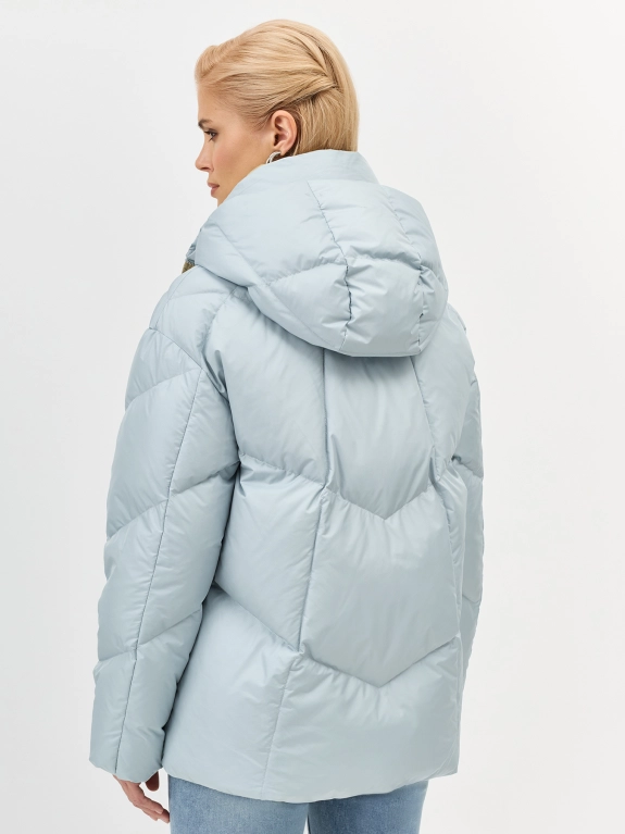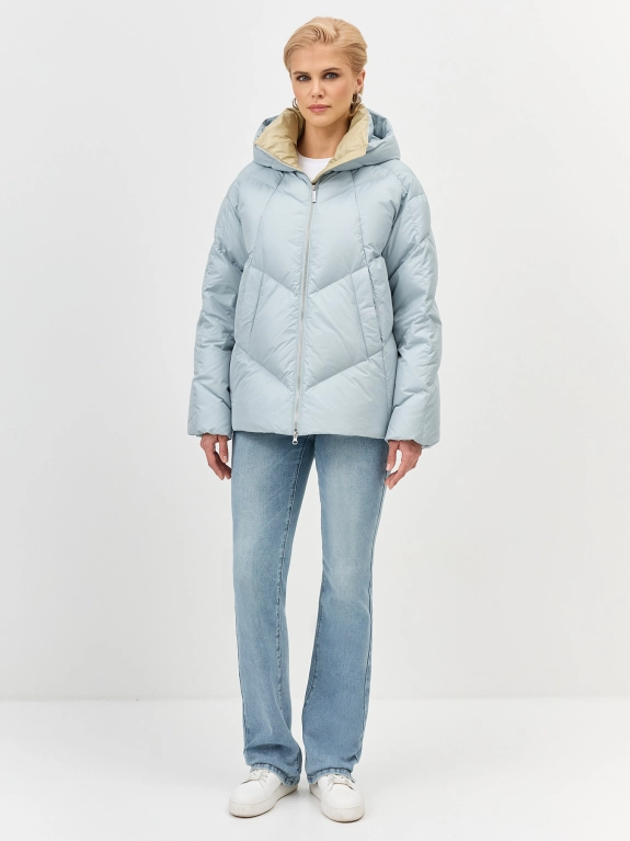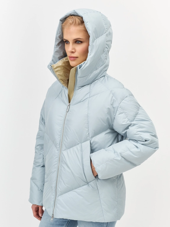 Объемная куртка на натуральном утеплителе с радиальной стежкой. Свободный силуэт. Спущенная линия плеч. Высокий воротник стойка дополнен капюшоном с контрастной подкладкой. Застежка на молнию. Боковые карманы с листочками. Кулиса по низу изделия для защиты от ветра. В качестве утеплителя натуральный пух.