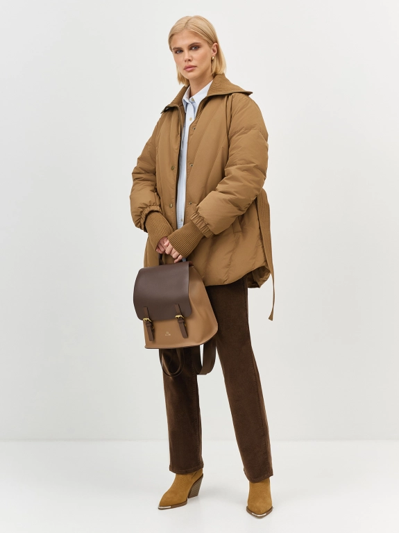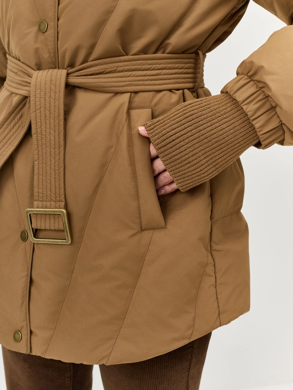 Объемная удлиненная куртка с трикотажной манишкой. Свободный силуэт можно приталить съёмным поясом. Спущенная линия плеч. Боковые карманы с листочками и флисовой тёплой подкладкой. V-образный вырез. Оригинальные рукава с драпировкой и трикотажными манжетами и резинками по низу. Кулиса по низу изделия для защиты от ветра. Застежка на кнопки. Внутрення трикотажная манишка на молнии. Высокий воротник стойка манишки меняется на отложной. В качестве утеплителя натуральный пух.