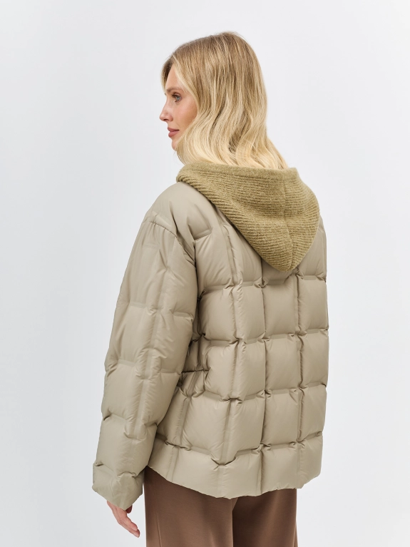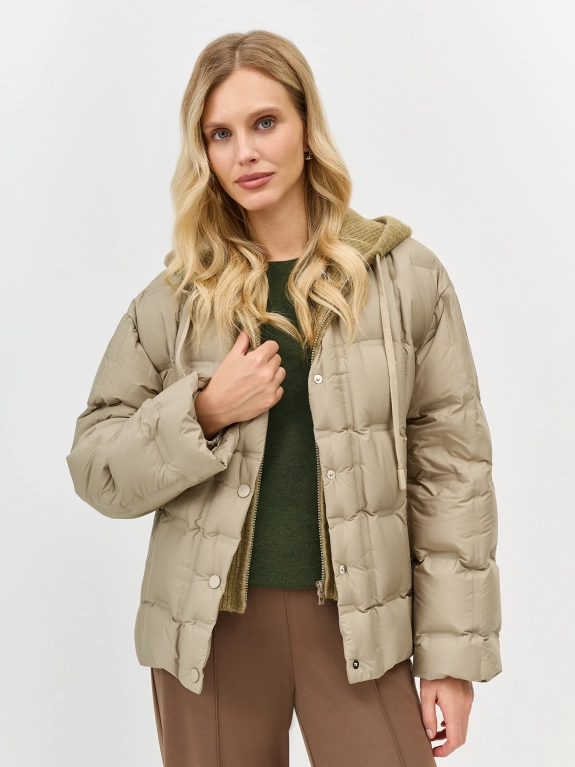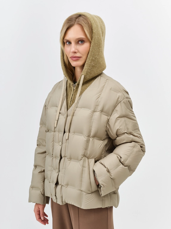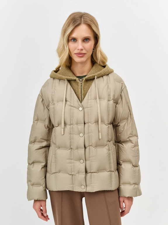 Комбинированная куртка с трикотажной манишкой. Свободный силуэт. Спущенная линия плеч. Горячая квадратная стежка. V-образный вырез. Застежка на кнопки в цвет. Боковые карманы с листочками. Кулиса по низу изделия для защиты от ветра. Внутренняя трикотажная манишка на молнии с капюшоном. В качестве утеплителя натуральный пух.