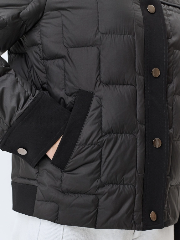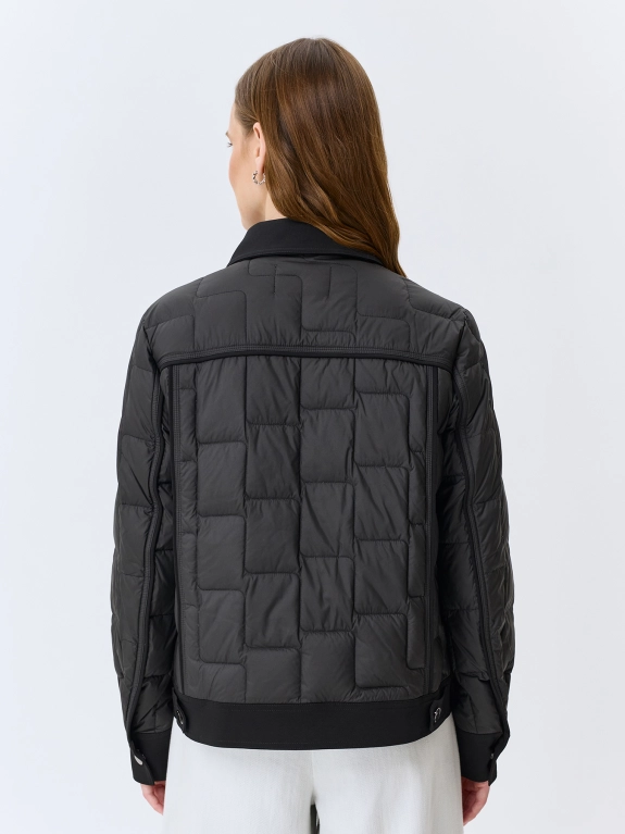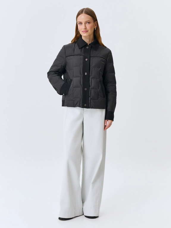 Куртка с квадратной графичной стежкой на натуральном утеплителе. Прямой силуэт. Застежка на кнопки. Отложной воротник. Боковые карманы с листочками. Воротник, планка, манжеты рукавов и отделка карманов- из гладкого плотного текстиля. Кнопки на манжетах и хлястиках по низу изделия.