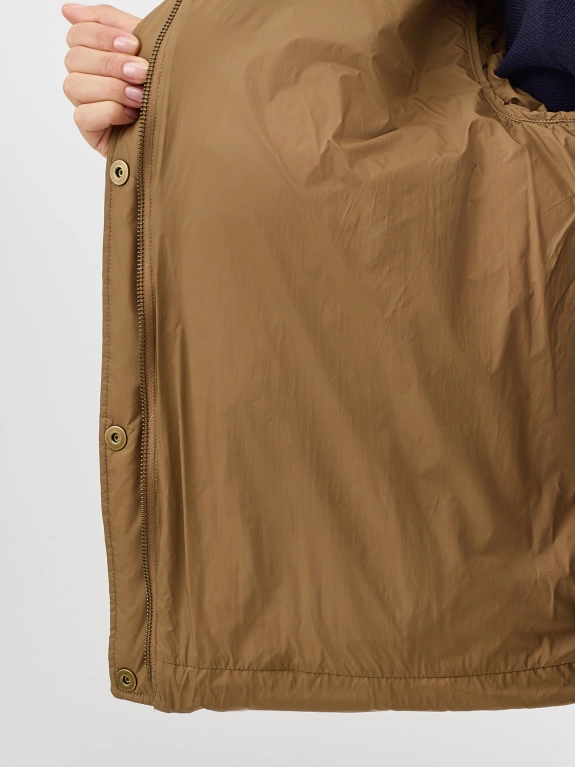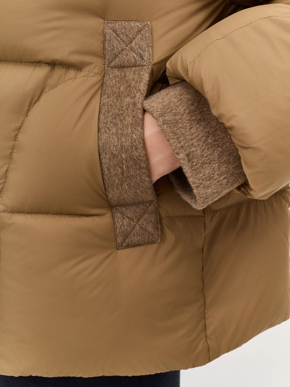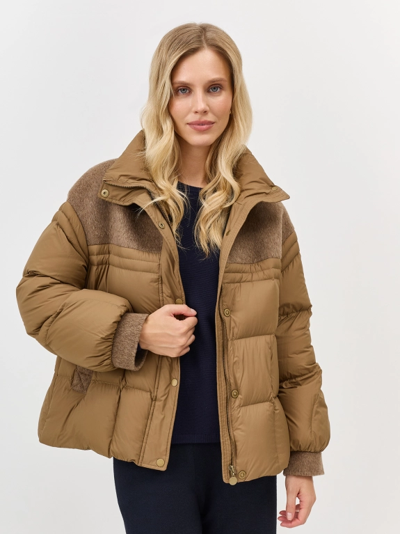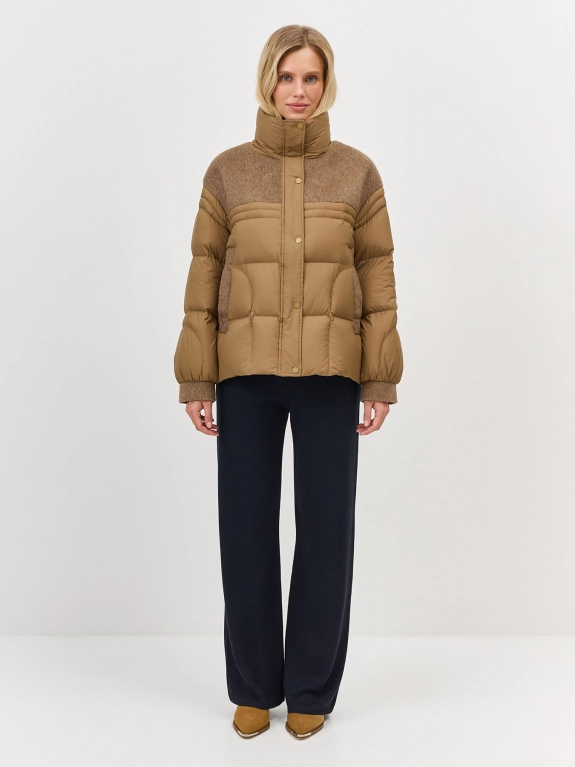 Теплая куртка с оригинальной стежкой и шерстяными вставками. Спущенная линия плеч. Воротник стойка. Застежка на молнию и планку с кнопками. Кулиса по низу изделия для защиты от ветра. Боковые карманы с листочками из шерстяной ткани. Шерстяные манжеты по низу рукавов. В составе натуральный утеплитель.
