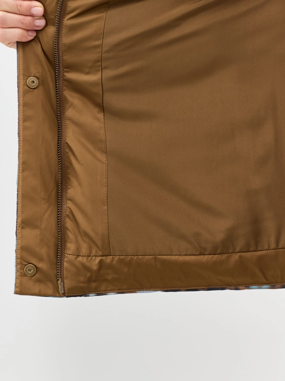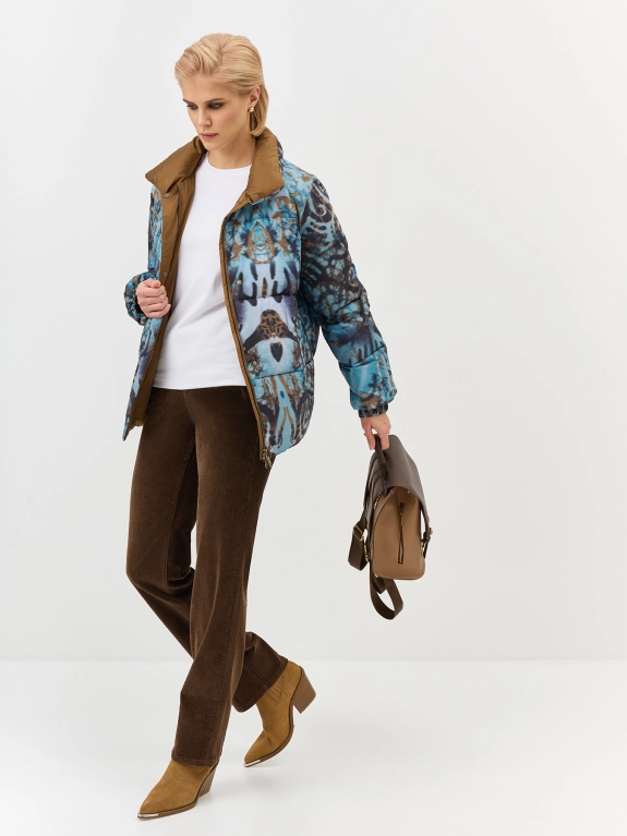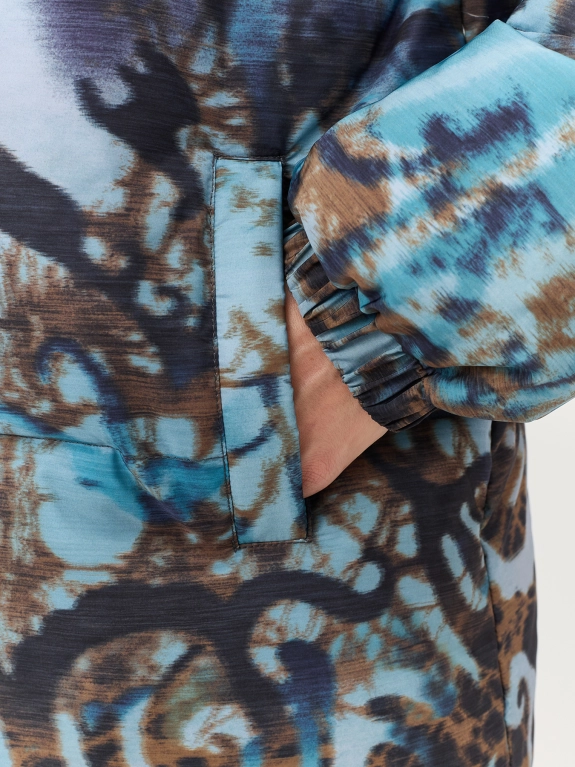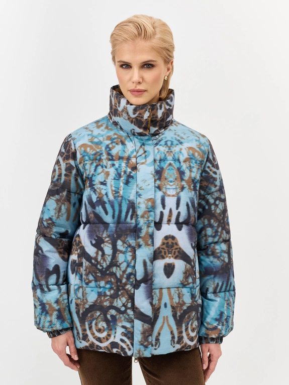 Яркая куртка с красочным дизайнерским принтом прямого силуэта. Воротник стойка. Боковые карманы с листочками. Застежка на молнию и планку со скрытыми кнопками. Втачные рукава. Резинки по низу рукавов и кулиса по низу для защиты от ветра.