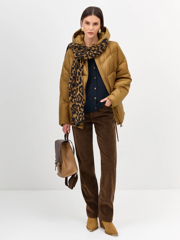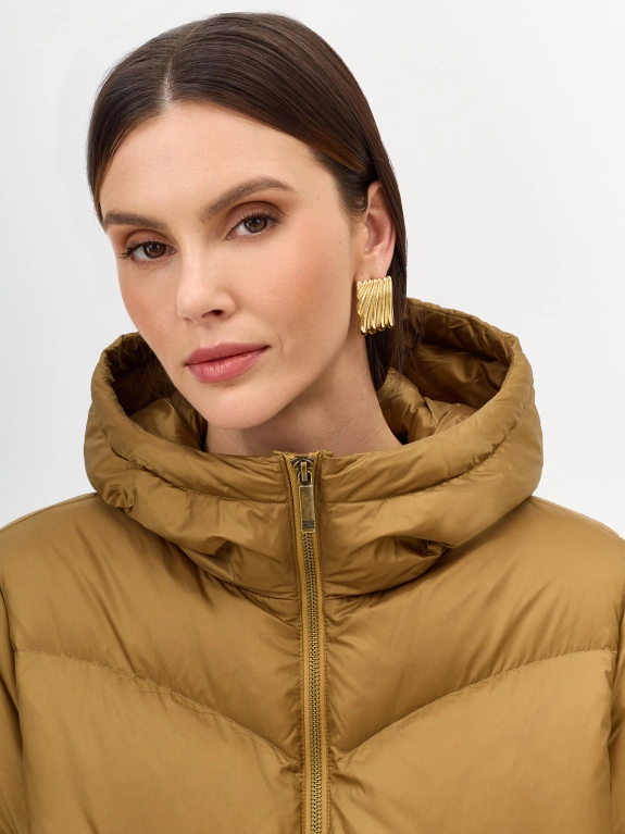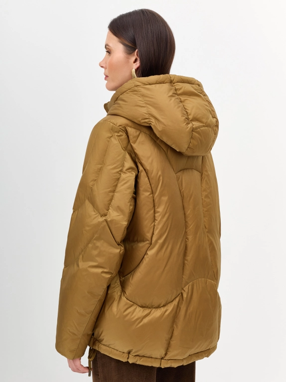 Яркая куртка из легкого нейлона с эффектом металлик. Свободный силуэт. Застежка на молнию. Декоративная тесьма по низу изделия для утяжки и защиты от ветра. Фигурная стежка. Воротник стойка дополнен капюшоном с утяжкой. Боковые карманы на потайных молниях. В составе натруральный утеплитель.