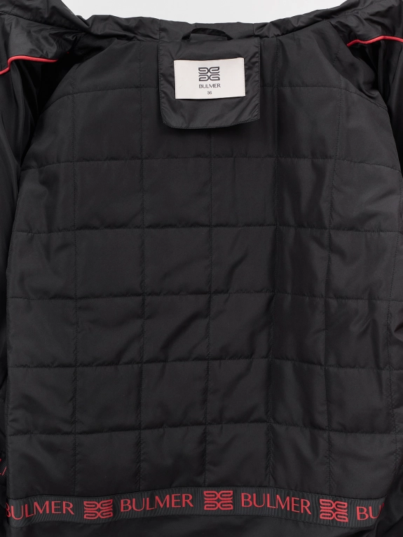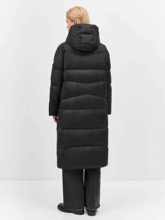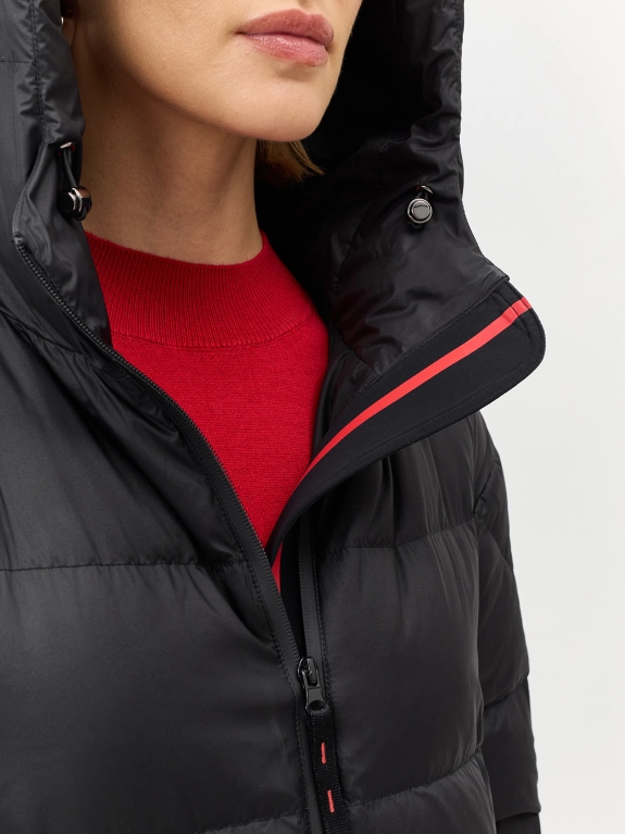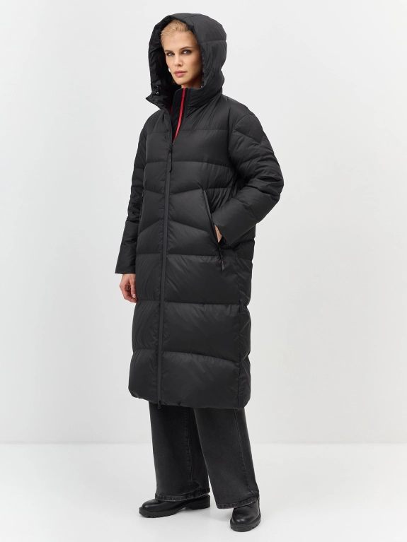 Удлиненное пуховое пальто прямого силуэта. Длина миди. Спущенная линия плеч. Застежка на молнию. Воротник стойка дополнен капюшоном. Боковые карманы на молниис теплой флисовой подкладкой. Дополнено яркими контрастными кантами и лентой с лого принтом на подкладке. В качестве утеплителя натуральный пух. Спинка дополнительно утеплена синтепоном.