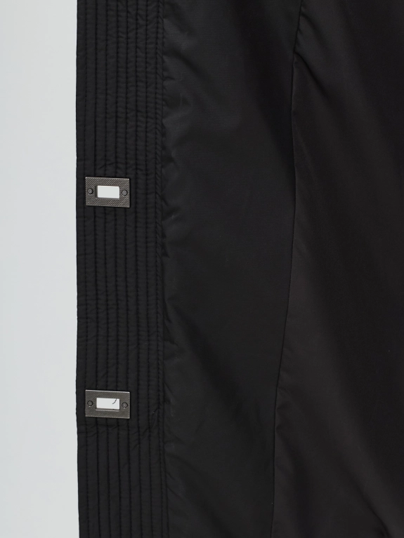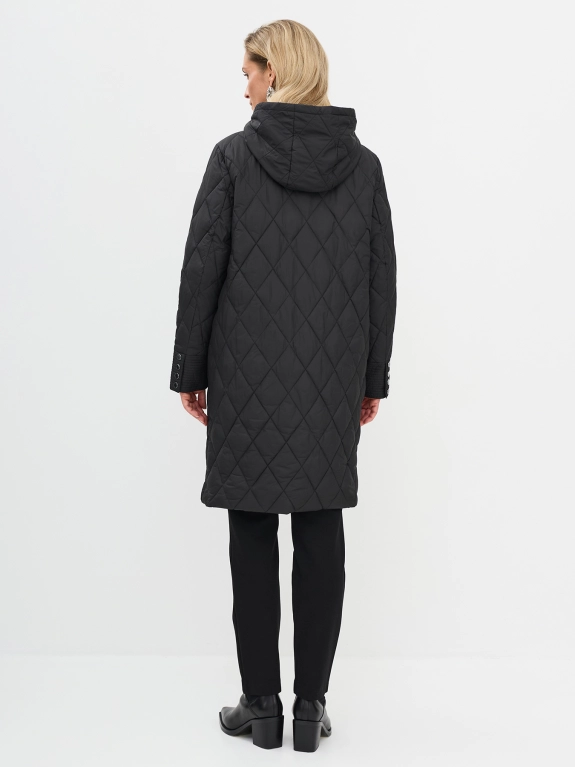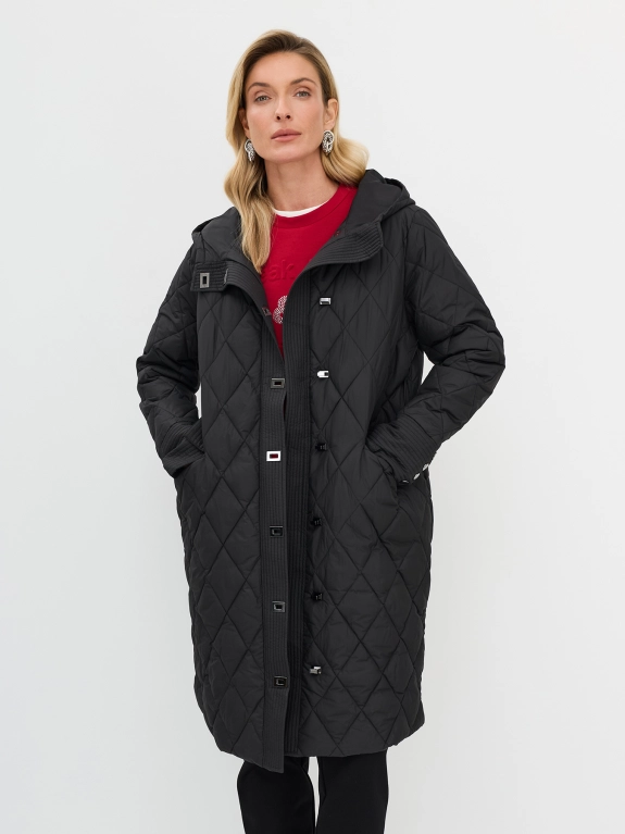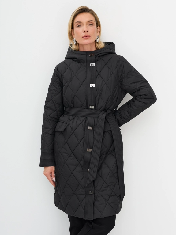 Пальто с ромбовидной стежкой и акцентными застежками. Прямой силуэт можно приталить поясом. Боковые карманы с клапанами. Воротник стойка. Врезные замки по планке.