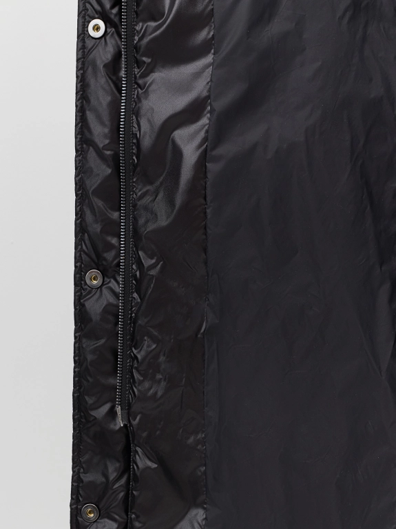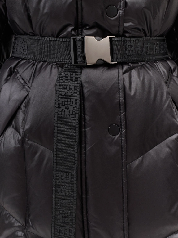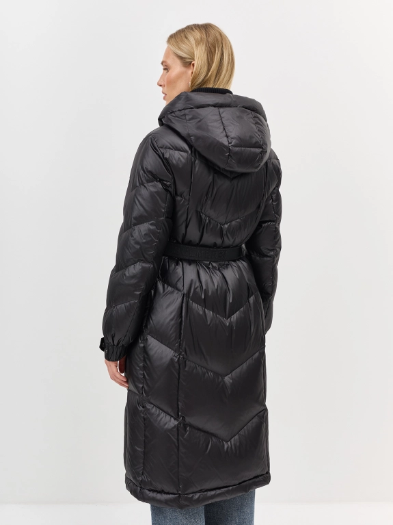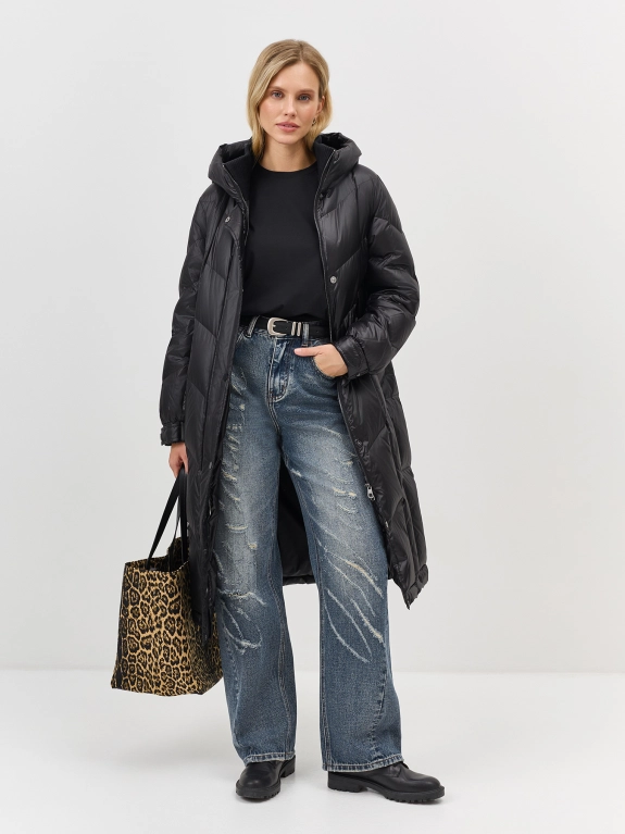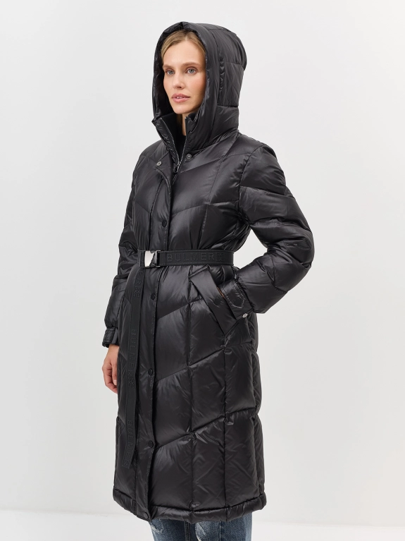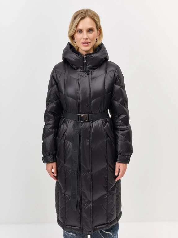 Пальто из 100% нейлона на натуральном утеплителе. Свободный силуэт можно приталить поясом. Длина миди. Застежка на молнию и кнопки. Воротник стойка дополнен капюшоном. Диагональная стежка. Паты на кнопках по низу рукавов. Боковые карманы с листочками на кнопках. В составе натуральный утеплитель.