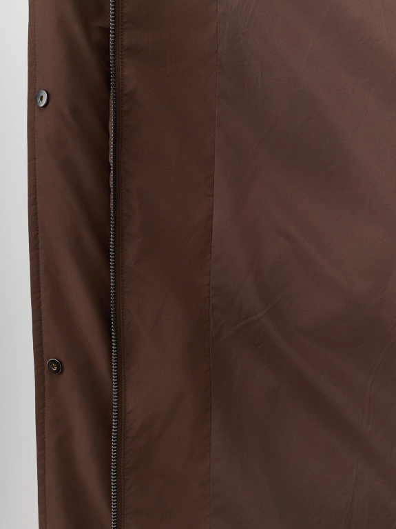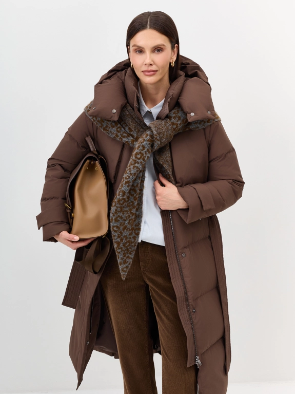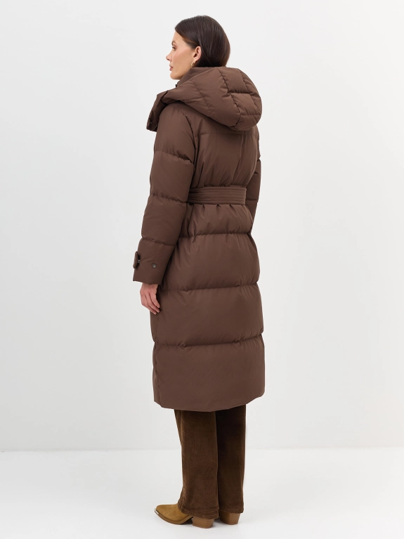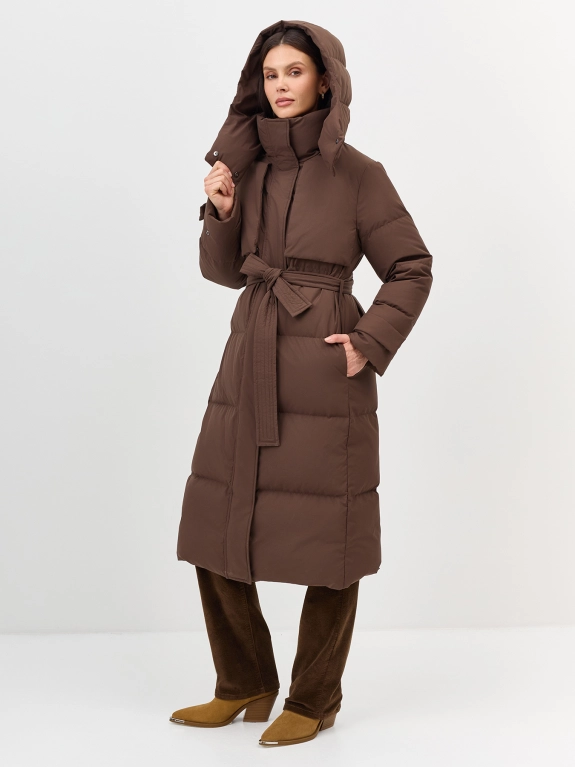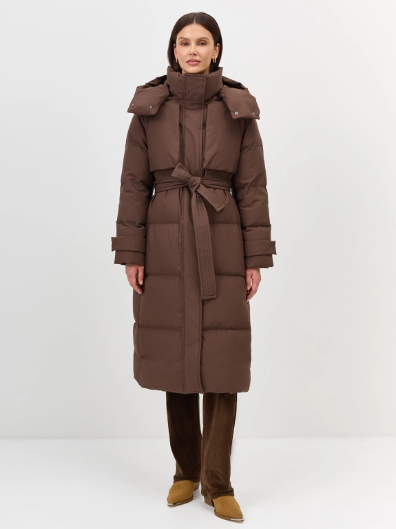 Длинный пуховик со съемным капюшоном. Свободный силуэт можно приталить съемным поясом. Длина миди. Застежка на молнию и планку с потайными кнопками. Воротник стойка дополнен съемным капюшоном на кнопках. Боковые карманы в швах. Паты по низу рукавов на кнопках. Дополнено отлетной кокеткой на кнопках. В качестве утеплителя натуральный пух.