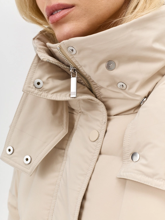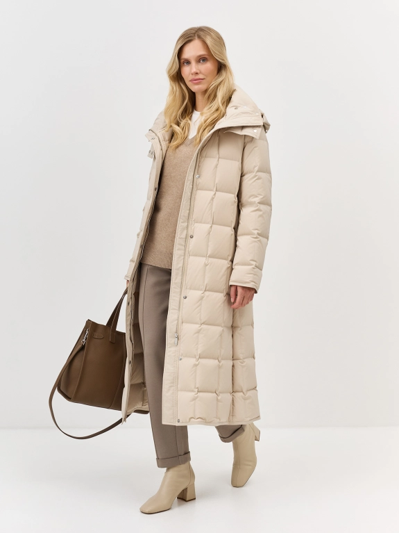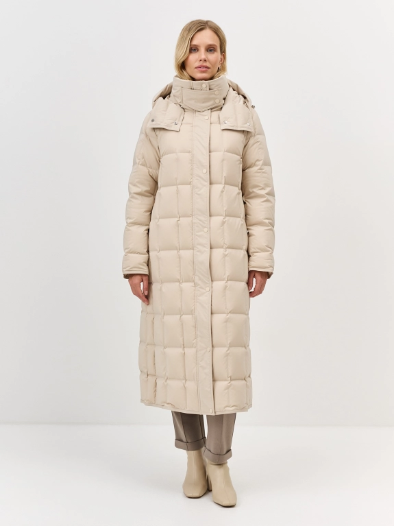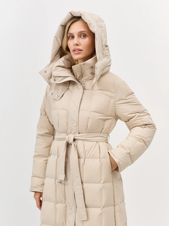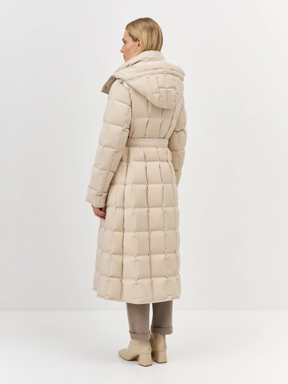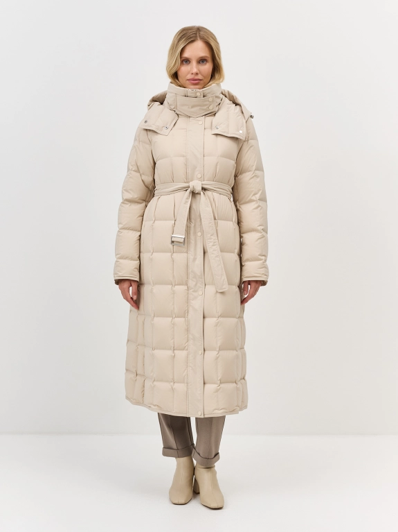 Утепленное пальто из фактурной ткани с крэш эффектом. Свободный силуэт можно приталить съемным поясом с пряжкой. Длина миди. Квадратная горячая стежка. Застежка на молнию и ветрозащитную планку с кнопками. Воротник стойка дополнен съемным капюшоном на кнопках. Боковые карманы в швах. Декоративная пата на кнопках по линии воротника. В качестве утеплителя натуральный пух.