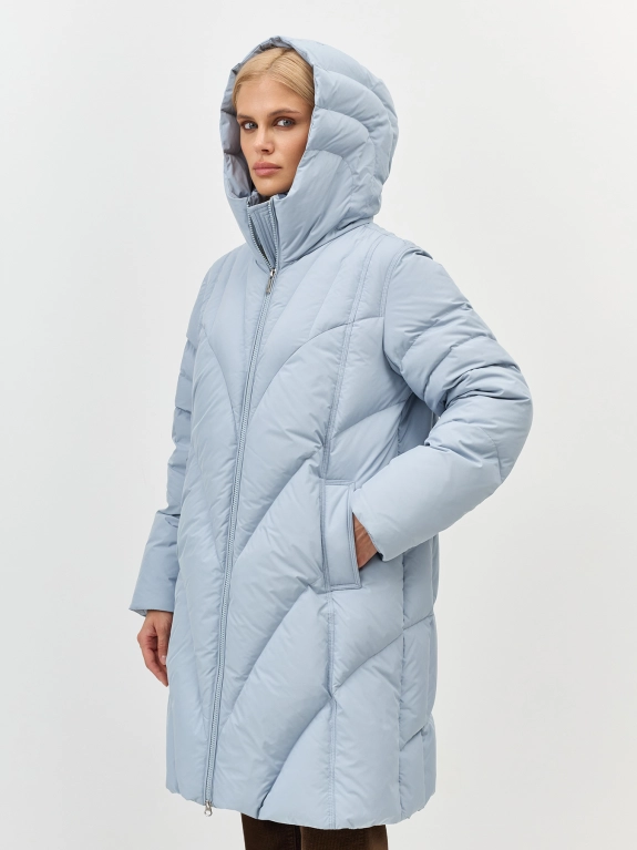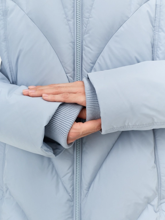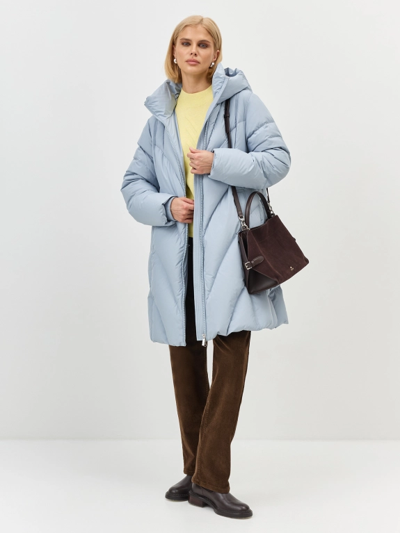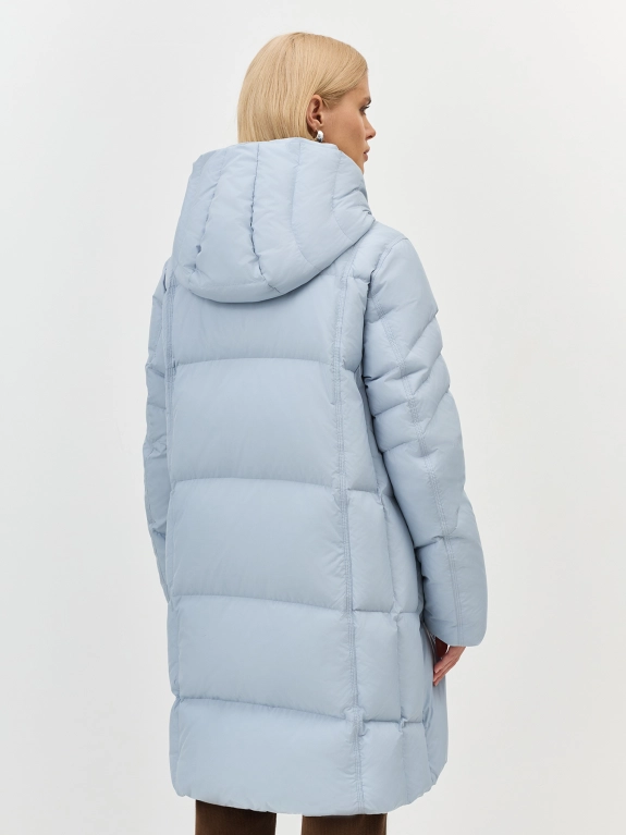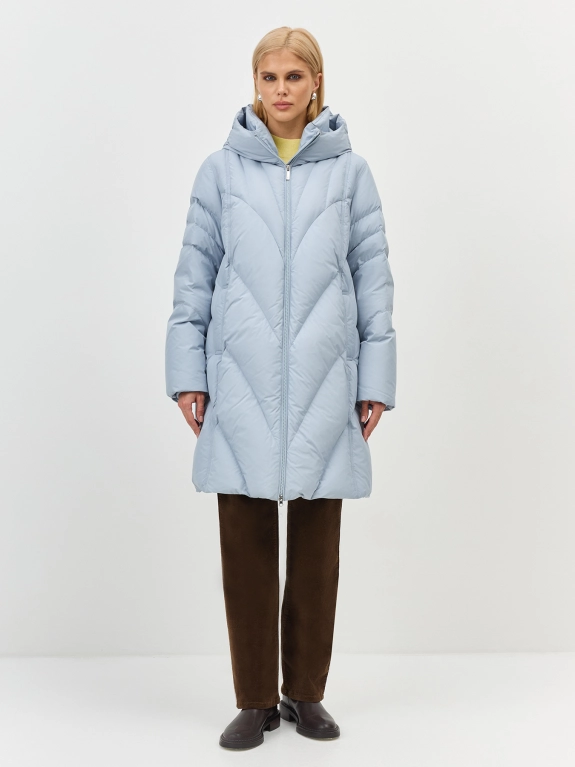 Пуховик с фигурной стежкой свободного А-силуэта. Длина до колен. Воротник стойка дополнен капюшоном. Втачные рукава с трикотажными манжетами. Застежка на молнию в цвет. Боковые карманы с листочками. Дополнен подкладкой из 100% нейлона. В качестве утеплителя натуральный пух.