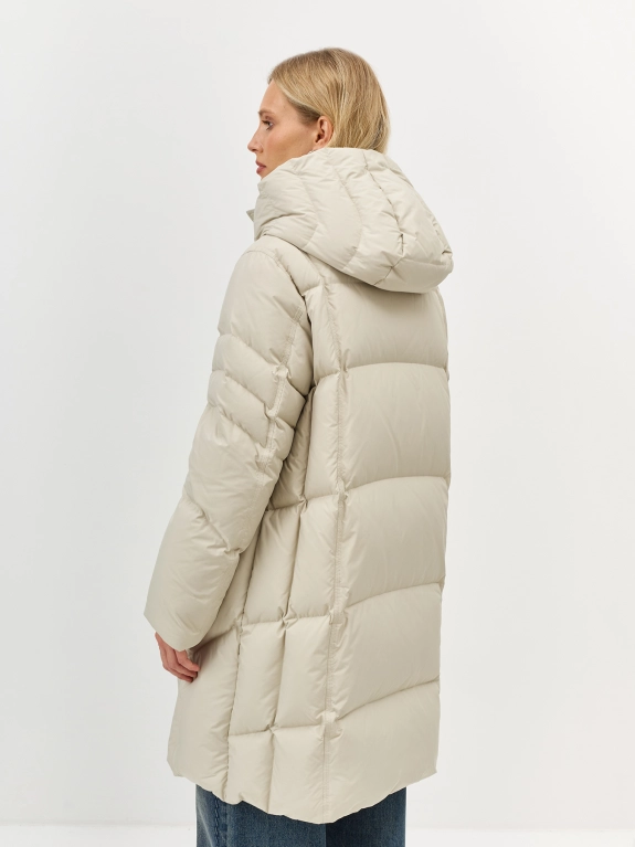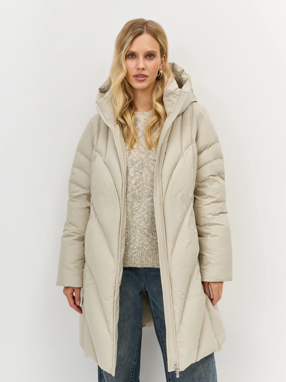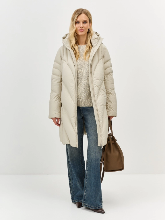 Пуховик с фигурной стежкой свободного А-силуэта. Длина до колен. Воротник стойка дополнен капюшоном. Втачные рукава с трикотажными манжетами. Застежка на молнию в цвет. Боковые карманы с листочками. Дополнен подкладкой из 100% нейлона. В качестве утеплителя натуральный пух.