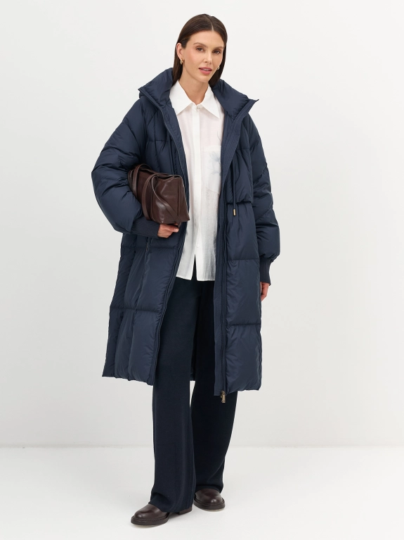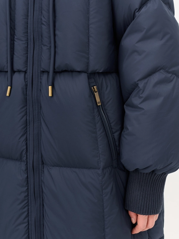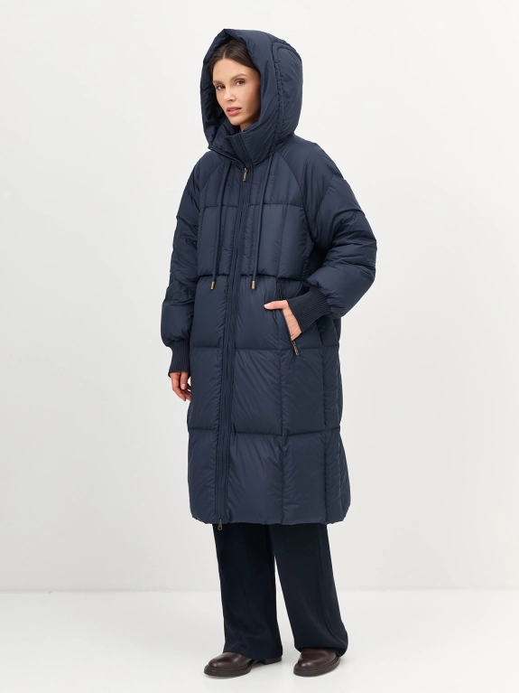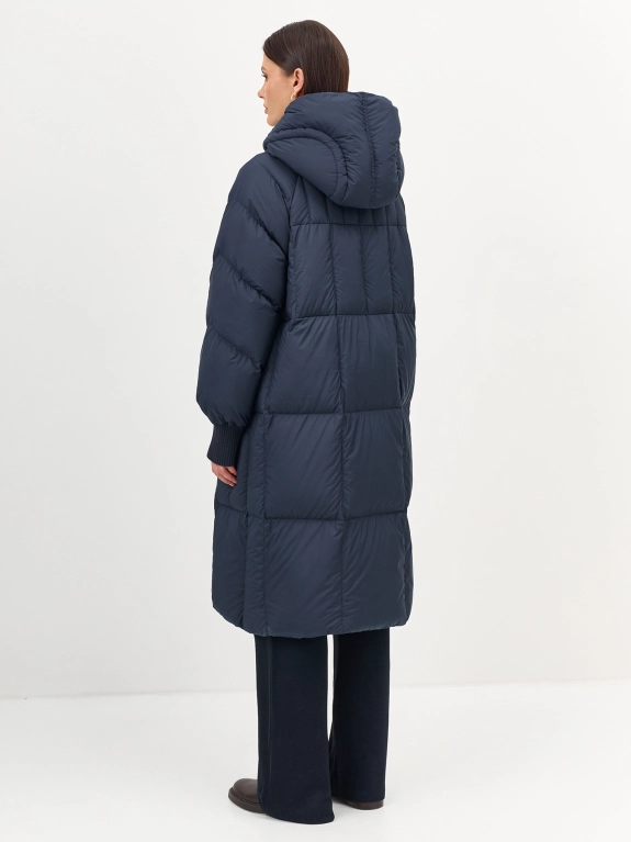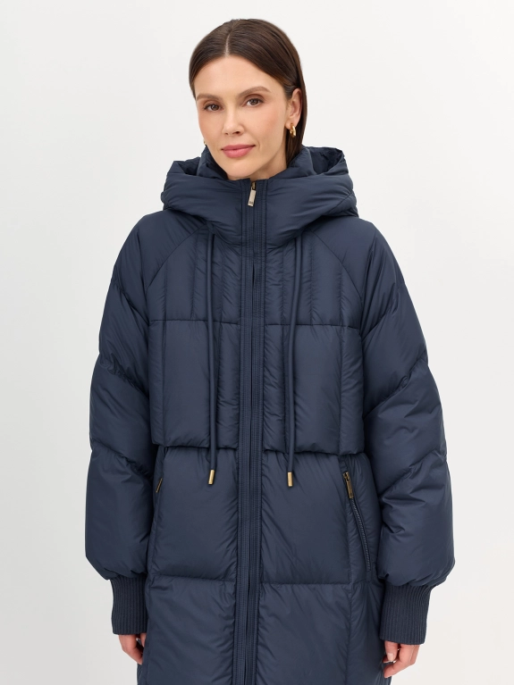 Теплый пуховик с капюшоном в длине миди. Свободный силуэт. Спущенная линия плеч. Воротник стойка дополнен капюшоном со шнуром в цвет. Широкие трикотажные манжеты по низу рукавов реглан. Боковые карманы на молнии, дополнены флисовой подкладкой. В качестве утеплителя натуральный пух.