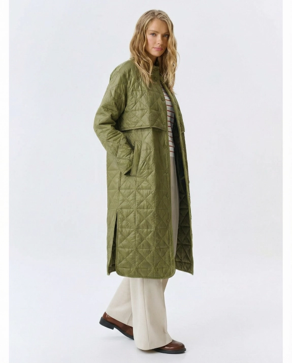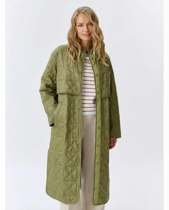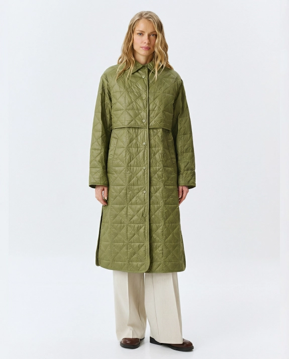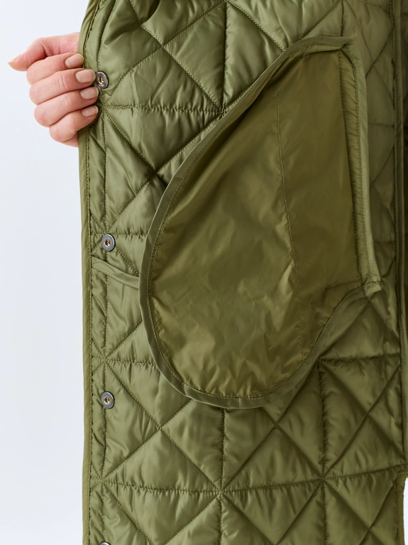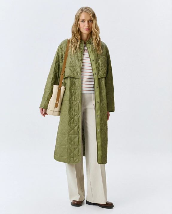 Тонкое утепленное пальто с фигурной стежкой. Прямой силуэт с отлетной кокеткой. Отложной воротник. Длинные втачные рукава. Застежка на брендированные кнопки. Боковые карманы с листочками. Дополнено акцентными разрезами в боковых швах. Искусственный утеплитель.