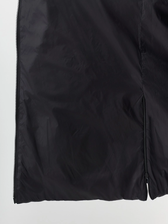 Укороченный пуховик в спортивном стиле из ткани с эффектом металлик. Свободный силуэт. Спущенная линия плеч. Застежка на молнию. Воротник стойка дополнен капюшоном с широкой репсовой лентой и контрастной подкладкой. Боковые карманы с листочками на молнии. Высокие шлицы на молнии в боковых швах. Подкладка пуховика из нейлона. В качестве утеплителя натуральный пух.