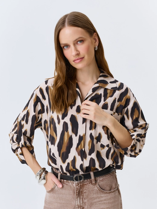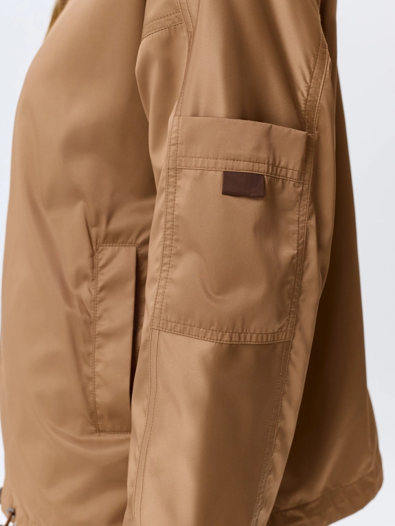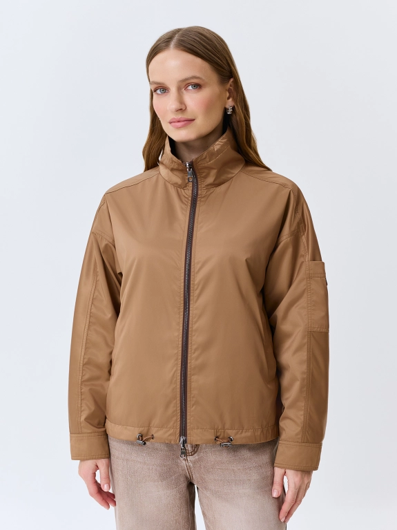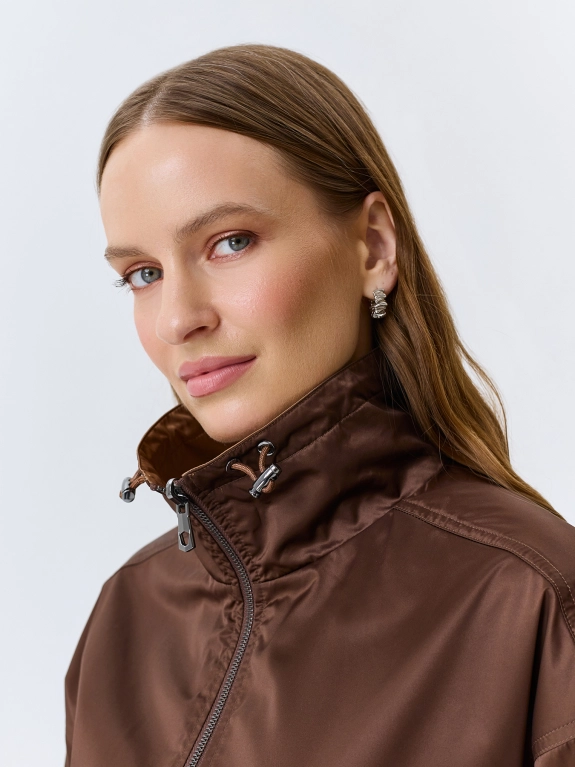 Двусторонняя сатиновая ветровка свободного силуэта. Воротник высокая стойка дополнен утяжниками. Застежка на молнию. Спущенная линия плеч и длинные втачные рукава с накладными карманами и манжетами по низу. Боковые карманы с листочками. Дополнена кулисой по низу изделия.