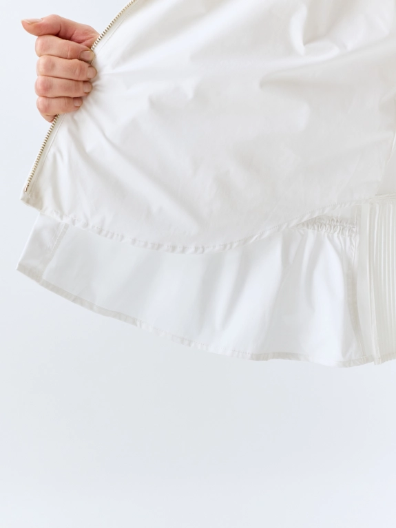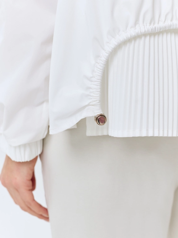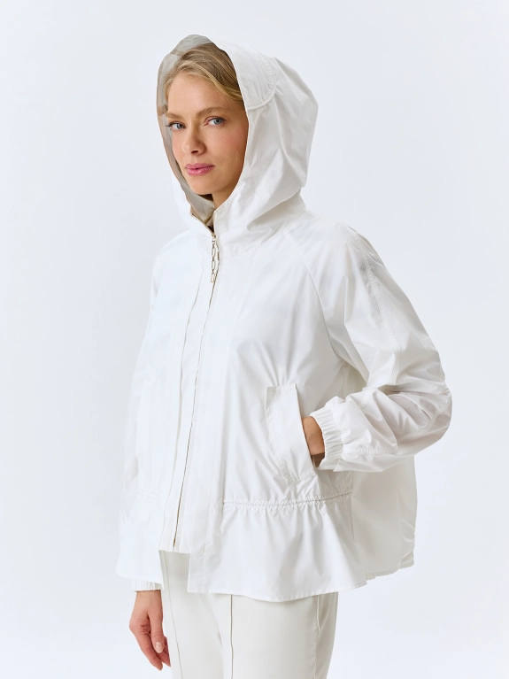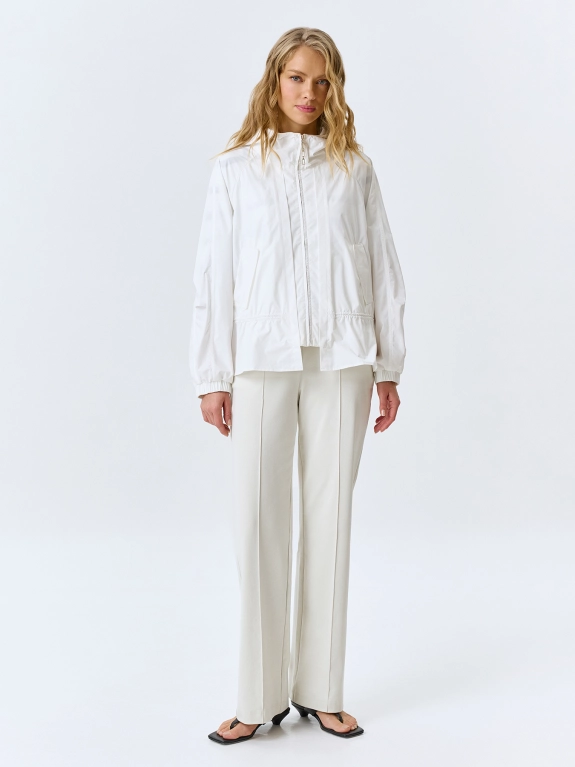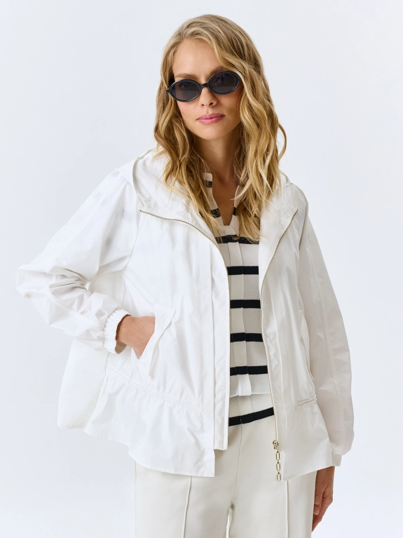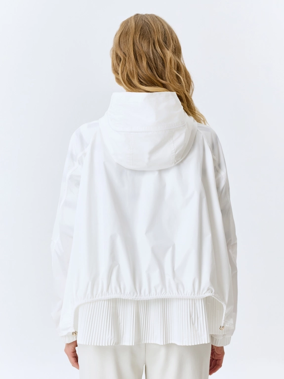 Легкая ветровка свободного силуэта. Воротник стойка Дополнен капюшоном на кулисе. Застежка на молнию. Спущенная линия плеч и длинные рукава с резинкой по низу. Боковые карманы с листочками. Дополнена резинкой по линии талии и фигурным вырезом с плиссированной деталью по спинке. Кулиса по линии низа.