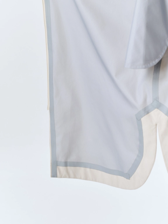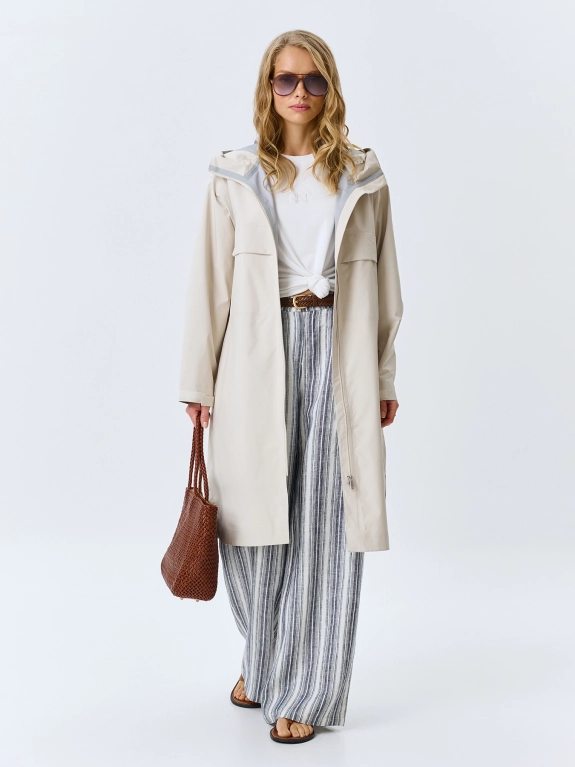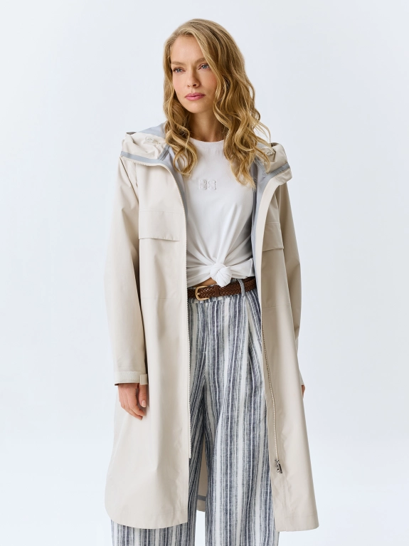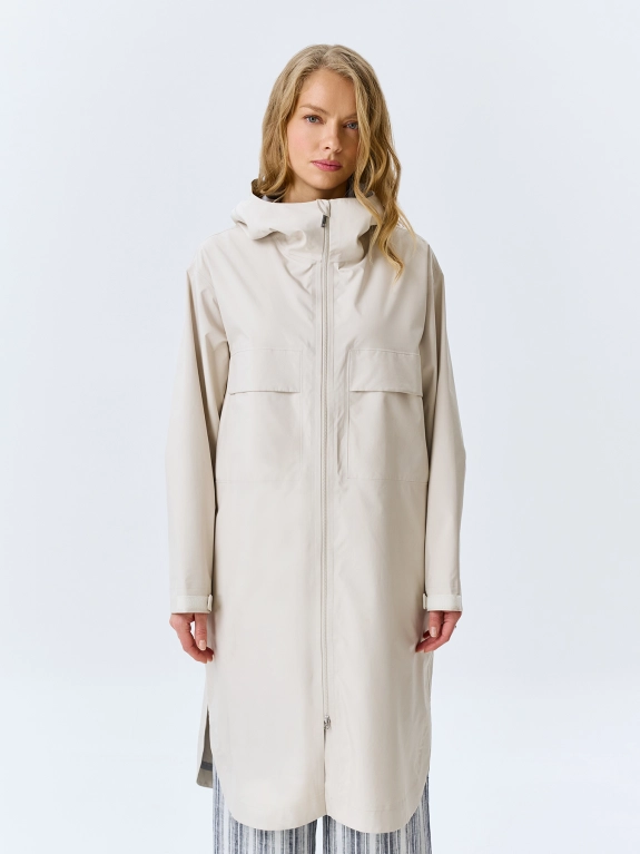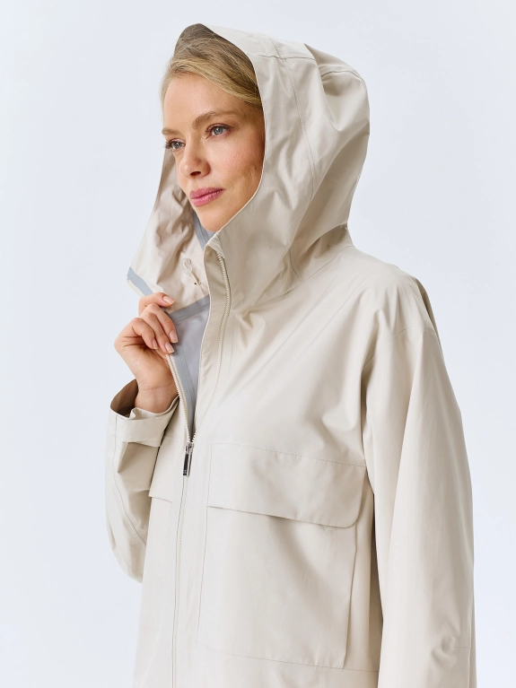 Плащ-дождевик свободного силуэта. Воротник стойка дополнен капюшоном. Застежка на молнию. Боковые карманы в швах. Накладные нагрудные карманы с клапанами и боковым входом. Длинные рукава с хлястиками с липучкой по низу. Дополнен акцентными фигурными разрезами по низу изделия. Плащ без подкладки с новой бесшовной технологией обработки.