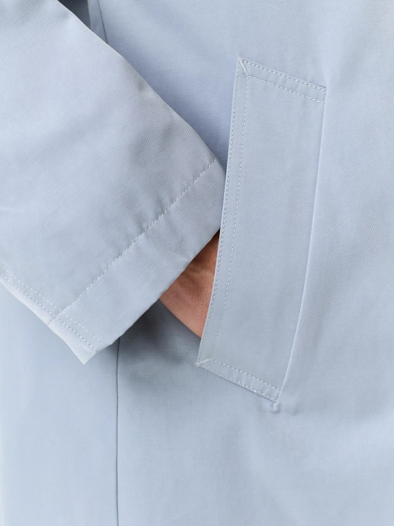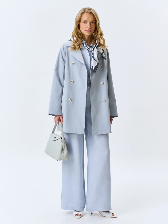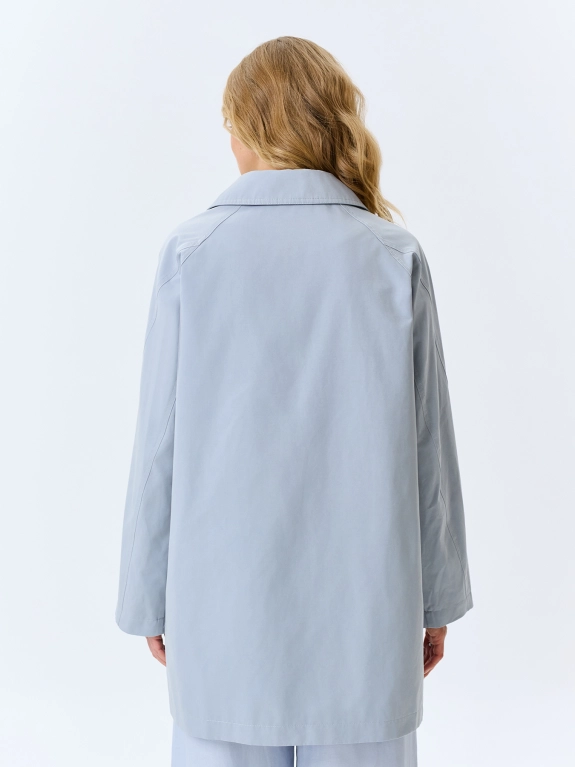 Укороченный тренч А-силуэта. Классический английский воротник. Двубортная застежка на пуговицы. Рукава реглан с декоративными швами. Боковые карманы с широкими листочками.