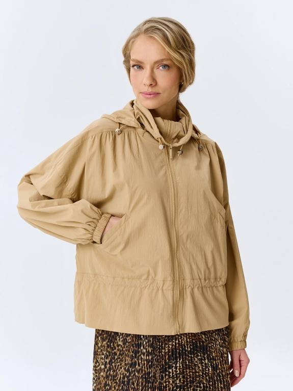 Ветровка из смесового нейлона и хлопка. Свободный силуэт. Высокий воротник стойка дополнен съемным капюшоном с эластичными утяжниками. Застежка на молнию. Спущенная линия плеч и широкие рукава с резинкой по низу. Дополнена кулисой по линии талии.