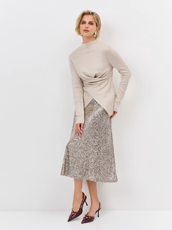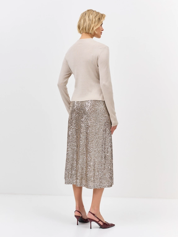 Трикотажнаяюбка-миди с искрящимися пайетками. Свободный силуэт. Застежка на молнию. Дополнена мягкими складками и шелковистой подкладкой.